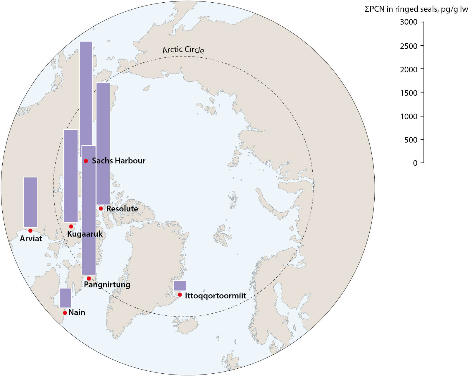Figure 2.83 ΣPCN concentrations in ringed seal from the Arctic. Canadian data (arithmetic means; female seals) from Muir et al. (unpubl. data): Arviat (2011–2012, n=23); Kugaaruk (2012, n=14); Nain (2013, n=9); Pangnirtung (2008–2010, n=12); Resolute (2011–2013, n=33); Sachs Harbour (2011–2013, n=32). East Greenland data (arithmetic mean; 2006; female and male seals) from Rotander et al. (2012b): Ittoqqortoormiit. Note that the congeners included in ΣPCN differ for the two studies as specified in Table 2.9/6.