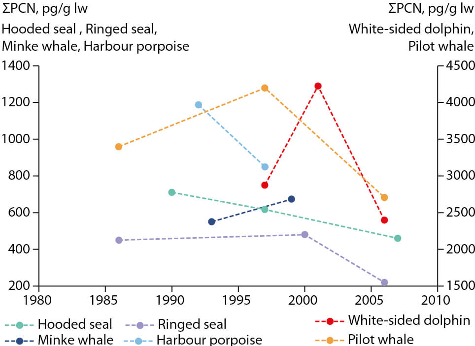 Figure 2.86 ΣPCN concentrations in marine mammals from the European Arctic (Rotander et al., 2012b). Concentrations in pilot whale and white-sided dolphin refer to the secondary y-axis. ΣPCN includes the following congeners: CN-52/60, CN-53/55, CN-66/67 and CN-69. The graphic shows mean concentrations for n=3, each of these samples comprising a pool of 3–6 individuals.