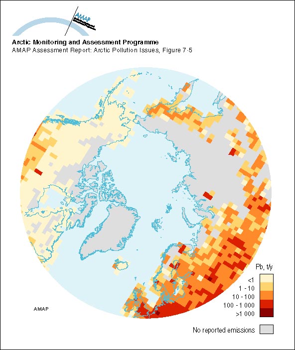 source of data: Norwegian Meteorological Institute, after Pacyna, J.M., B.D. Shin and P. Pacyna, 1993b. Global emissions of lead. Atmospheric Environment Service, Environment Canada, Ottawa. (AAR Figure 7.5)