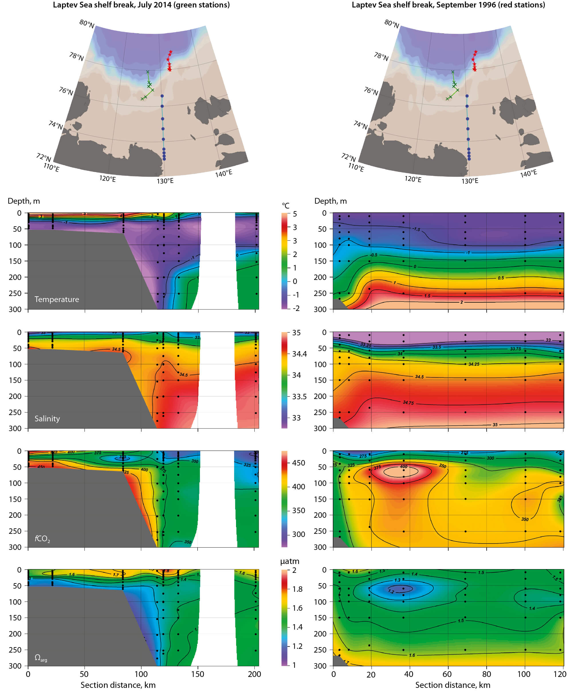 Figure A1.4 Properties in the upper 300 m at the Laptev Sea shelf break in 1996 and 2014, for the stations noted on the locator maps.