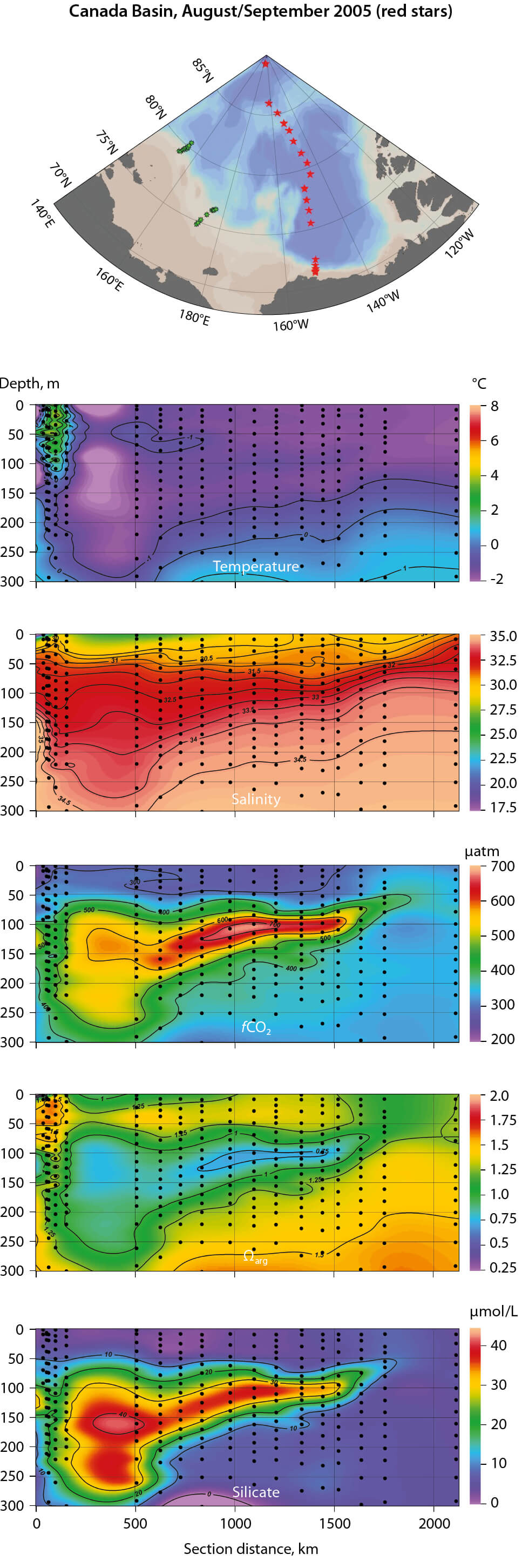 Figure A1.6 Properties across Canada Basin in August/September 2005, for the stations noted on the locator map.