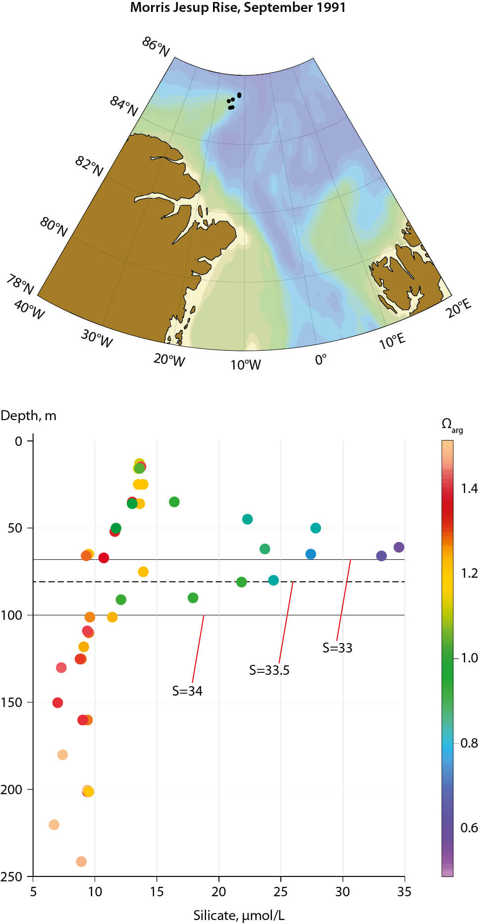 Figure A1.7 Silicate profiles, color coded by Ωarg, at the tip of the Morris Jesup Rise in 1991.