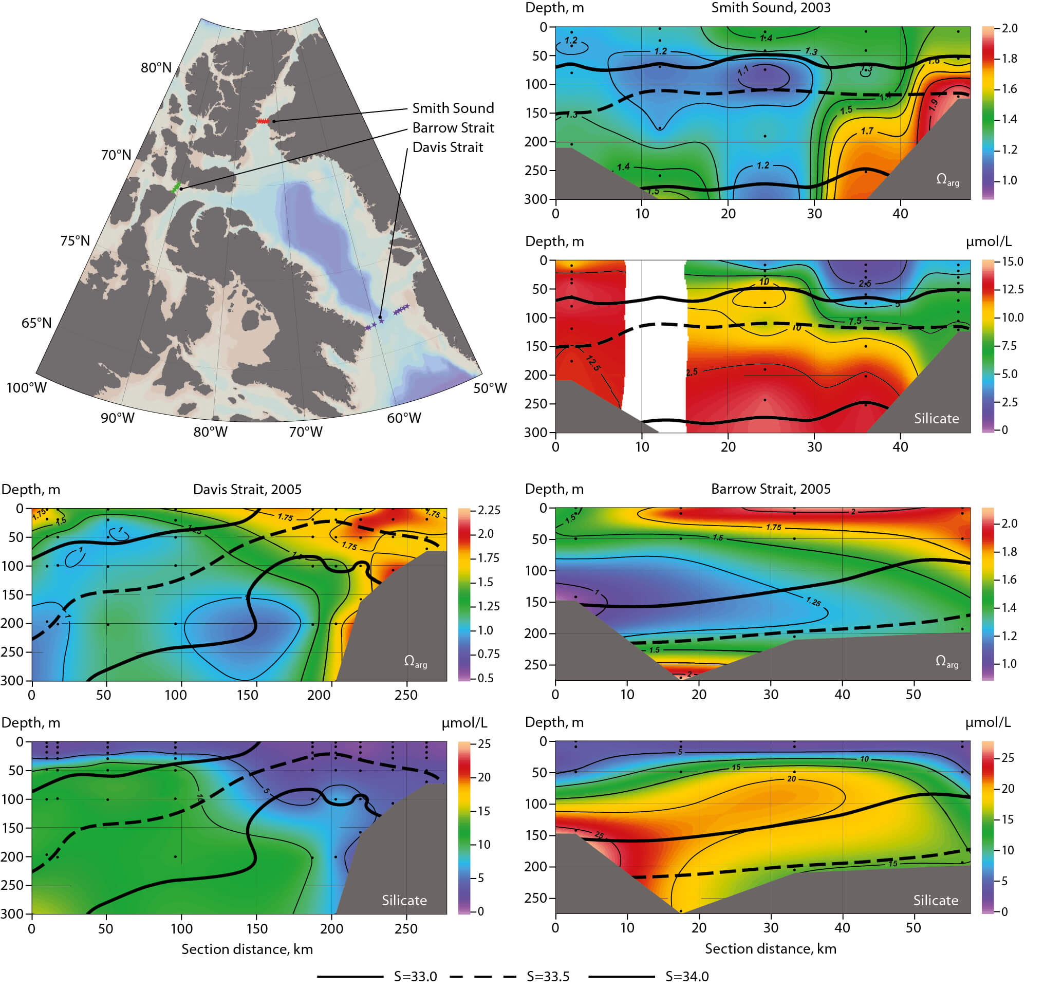 Figure A1.9 Properties across Barrow Strait in 2005, Smith Sound in 2003 and Davis Strait in 2005, for the stations noted on the locator map.