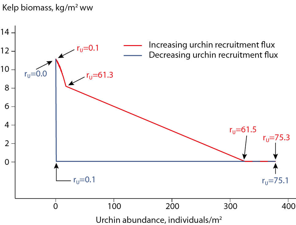 Figure A2.1 Hysteresis plot for the kelp-urchin dynamical model with no stochasticity, varying the parameter rU (urchin recruitment flux) from 0 to 75.3 and back again to 0.