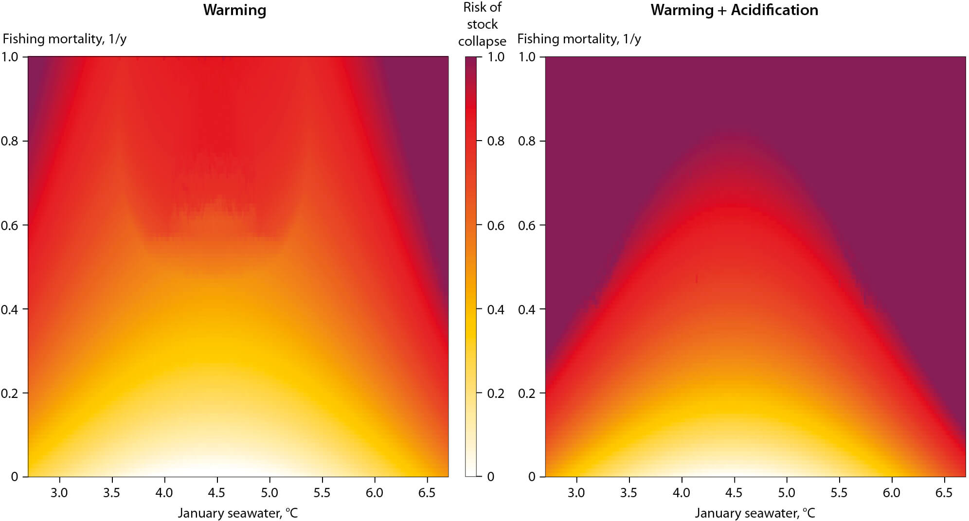 Figure A3.2 ‘Burning ember’ plots showing the combined effect of fishing and warming on the Northeast Arctic cod stock without taking into account extra mortality due to acidification (left panel) and the combined effect of fishing and warming plus the extra mortality due to acidification (right panel). In both plots, the January temperature ranges from 2.7°C (the minimum in the time series) to 6.7°C (somewhat above the maximum of the historical time series) and fishing mortality ranges from zero to one. Color codes show the risk-of-collapse-indicator, with darker shades indicating a higher risk of stock collapse.