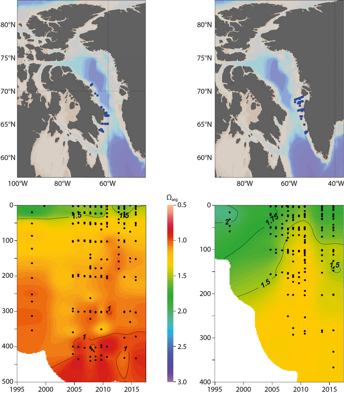 Figure A4.9 Temporal variation in aragonite saturation state (Ωarg) along Baffin Island and Greenland Shelves and Slopes between 1997 and 2015.
