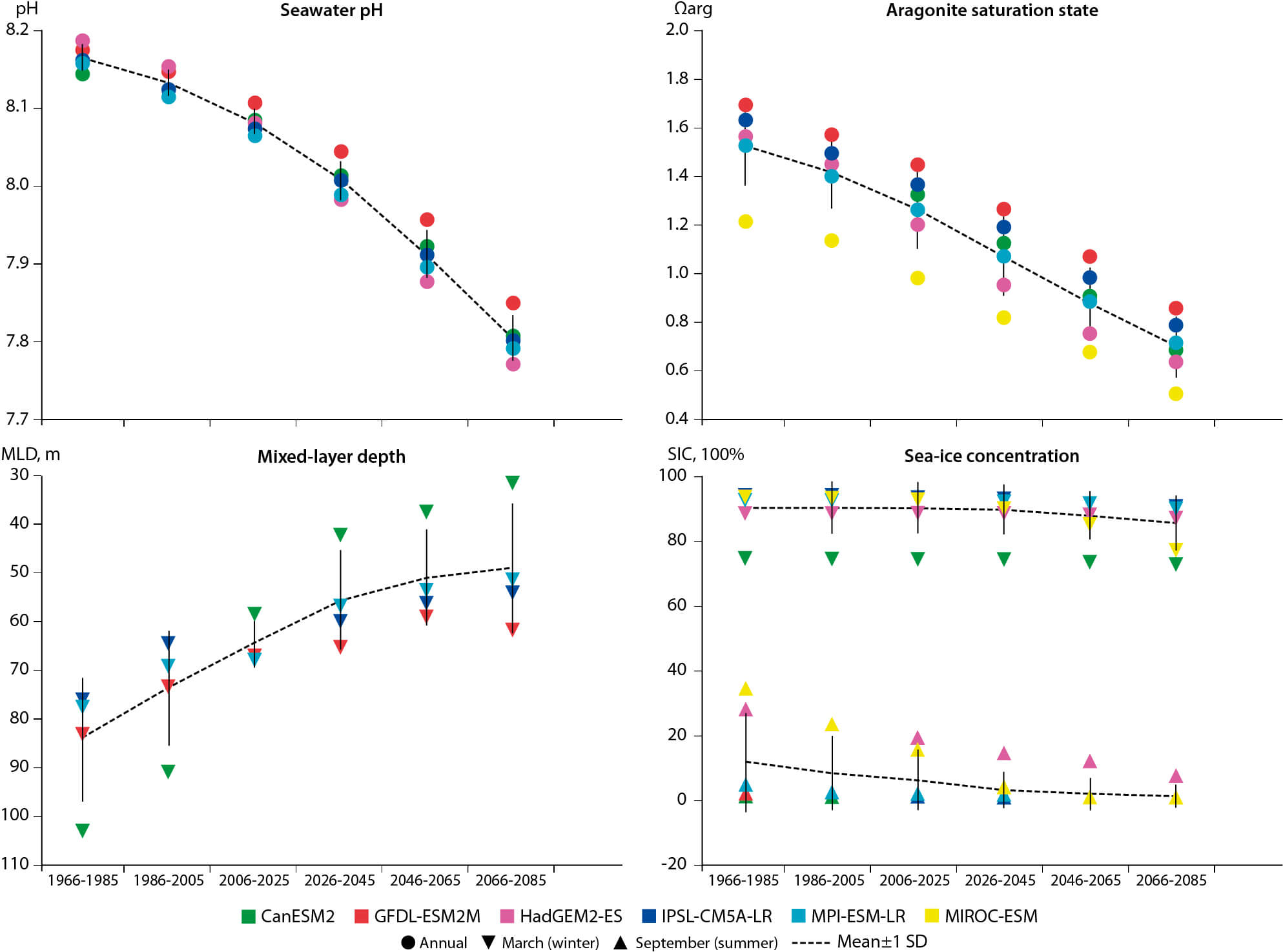 Figure A4.11 Multi-model comparison of bi-decadal averages in annual mean surface ocean pH, annual mean aragonite saturation state, maximum mixed layer depth in March, and sea-ice concentration in March and September under the IPCC RCP8.5 scenario for Baffin Bay (~65–77°N, 60–78°W). The graphic shows individual model averages as well as the multi-model mean and ±1 standard deviation. Note that pH is not available for MIROC-ESM and mixed layer depth is not available for MIROC-ESM and HadGEM2-ES.