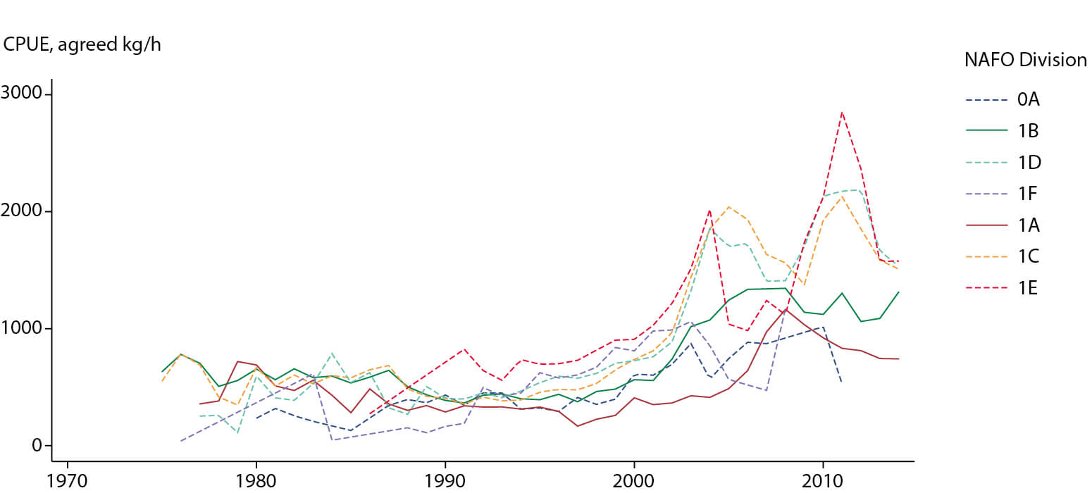 Figure A4.15 Catch per unit of effort (CPUE) for northern shrimp in West Greenland by NAFO Division for the period 1975–2014. Data from Arboe (2014).