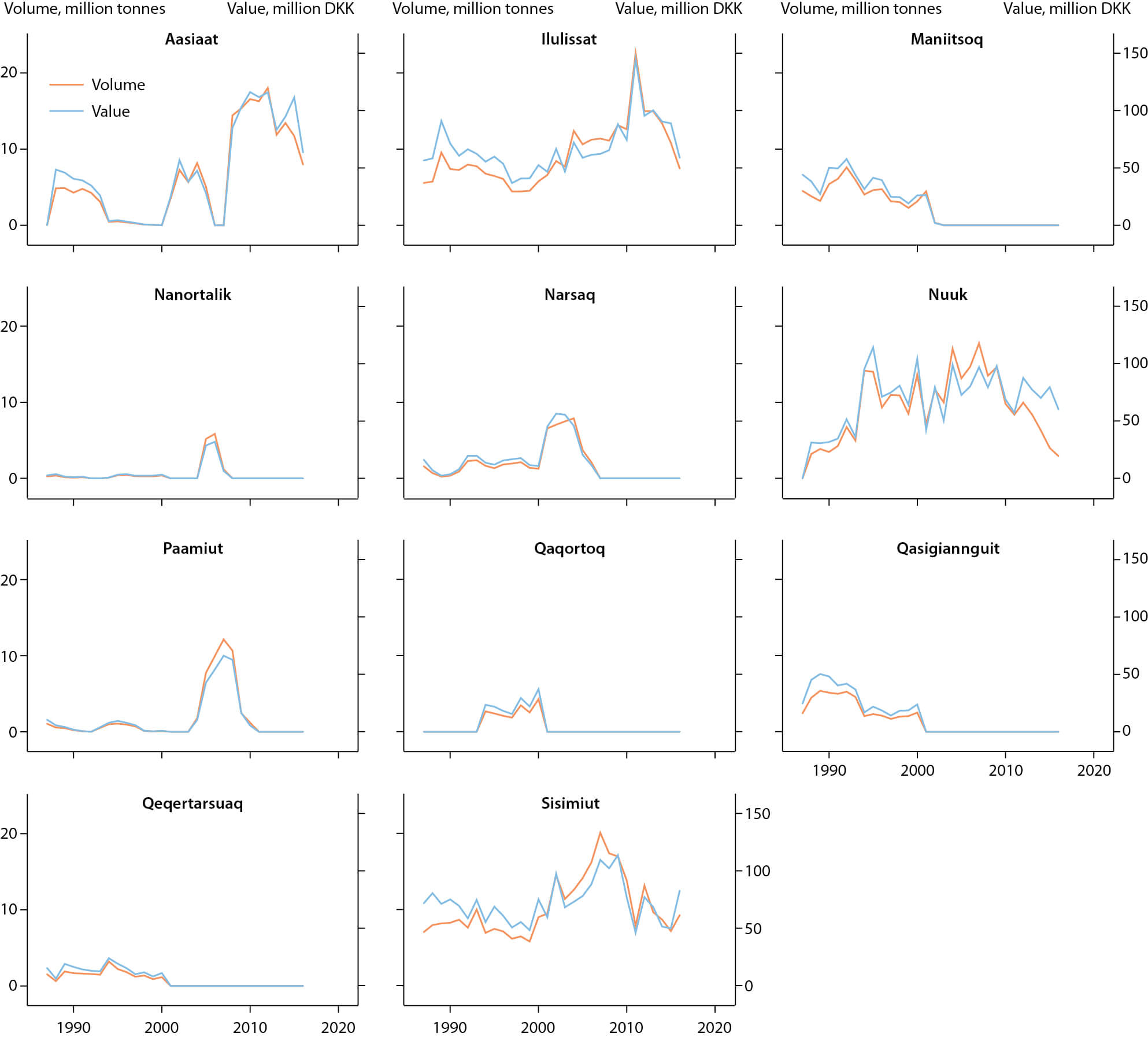 Figure A4.17 Volume and value of onshore Greenland northern shrimp processing for the period 1986–2016.