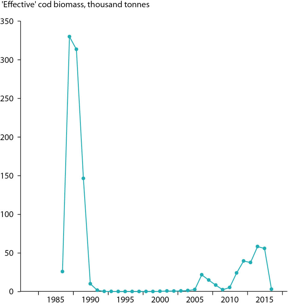 Figure A4.22 Index of the ‘effective’ cod biomass in NAFO Divisions 0A and 1. This index measures overlap between the stocks of Atlantic cod and northern shrimp (i.e., the amount of cod biomass expected to be at the right depth in the right place to predate on the shrimp) (Burmeister and Kingsley, 2016b).