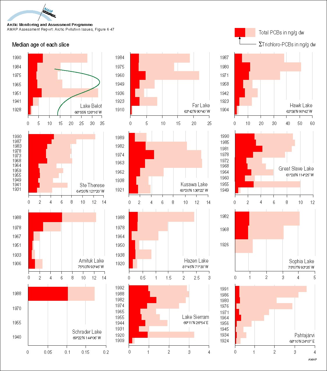 Historical profiles of PCBs (trichloro- and all other) in slices from dated sediment cores in Alaska, Canada, and Finland Median age of each slice is given on the vertical axis The green lines indicate the source function of PCBs