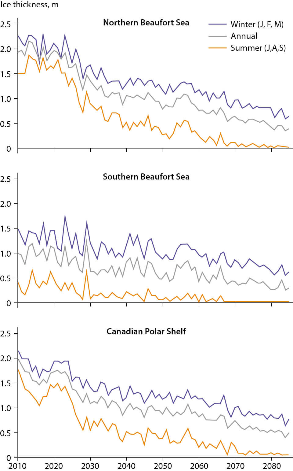 Figure A6.11 Simulated temporal evolution of seasonal ice thickness averaged over the northern Beaufort Sea, southern Beaufort Sea, and Canadian Polar Shelf.