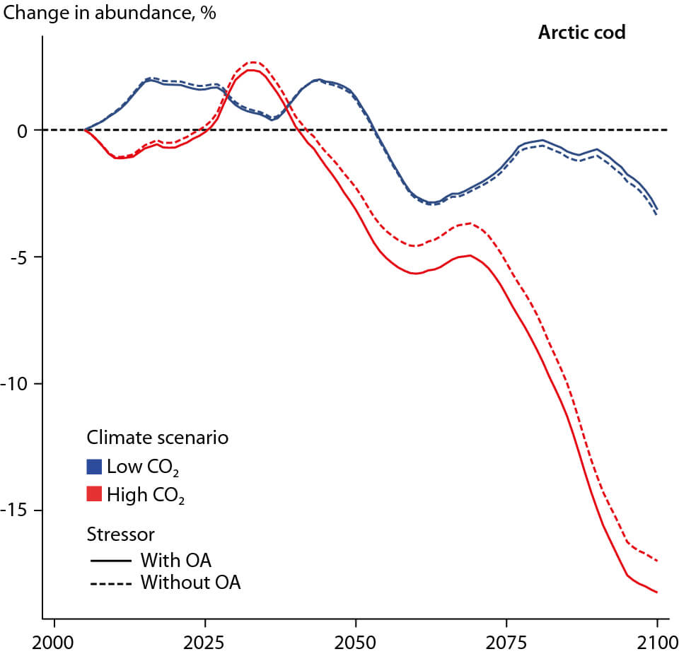Figure A6.17 Projected changes in abundance for Arctic cod for models with and without the effects of ocean acidification. Each line is the multi-model average of the three ESMs (GFDL, IPSL, MPI). Changes in abundance are 10-year running means and relative to the 2001–2010 average. Red indicates the high CO2 emission scenario (RCP8.5) and blue indicates low emissions (RCP2.6).