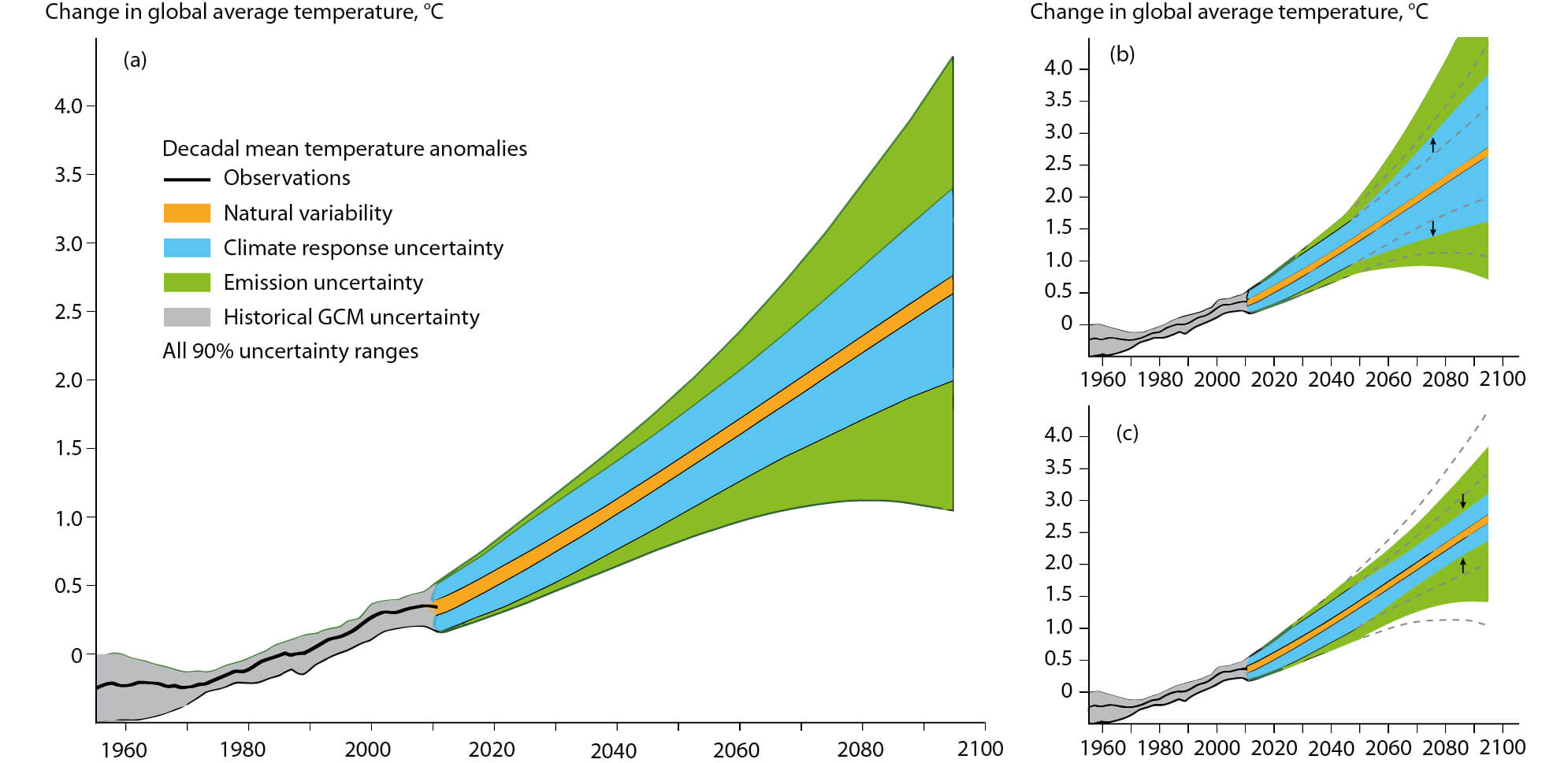 Figure A6.21 Relative importance of different uncertainties, and their evolution. The graphic shows (a) Decadal mean surface temperature change (°C) from the historical record, with climate model estimates of uncertainty for the historical period, along with future climate projections and uncertainty. Values are normalized by means from 1961 to 1980. Natural variability derives from model interannual variability, and is assumed constant with time. Emission uncertainty is estimated as the model mean difference in projections from different scenarios. Climate response uncertainty is based on climate model spread, along with added uncertainties from the carbon cycle, as well as rough estimates of additional uncertainty from poorly modelled processes. (b) Climate response uncertainty can appear to increase when a new process is discovered to be relevant, but such increases reflect a quantification of previously unmeasured uncertainty, or (c) can decrease with additional model improvements and observational constraints. The given uncertainty range of 90% means that the temperature is estimated to be in that range, with a probability of 90%. From Cubasch et al. (2013: FAQ 1.1 Figure 1).