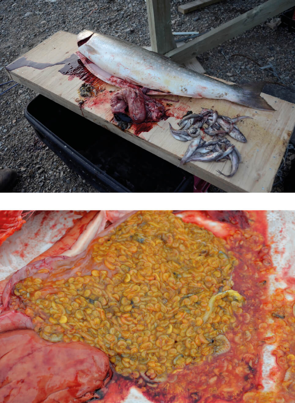 Figure A6.23 Arctic char – stomach contents containing about 40 Arctic cod (upper) (Cambridge Bay, 2012) and Arctic char, stomach contents dominated by zooplankton, Cambridge Bay 2011 (lower).
