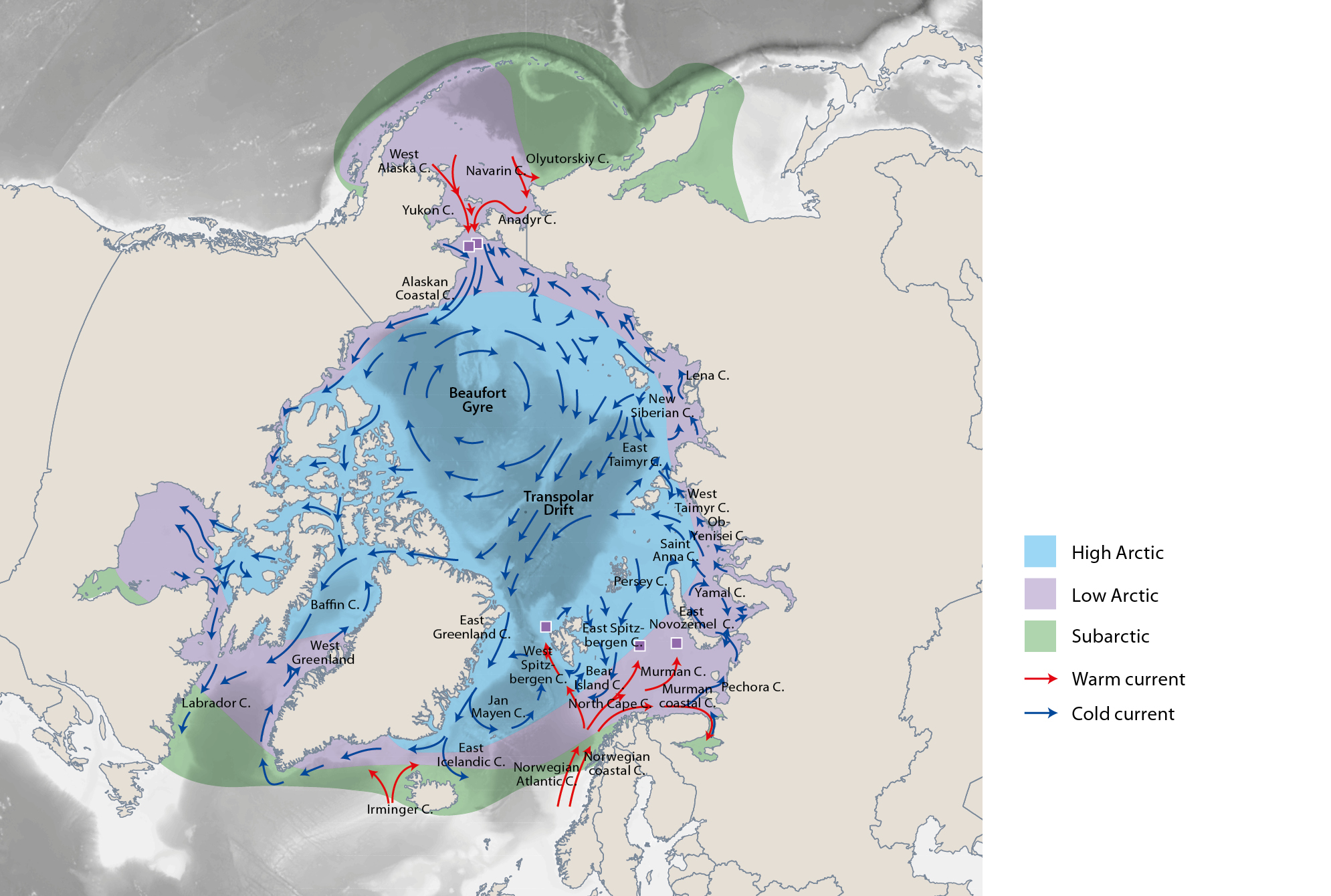 Figure 2.1 Major surface ocean currents within the High Arctic, Low Arctic and subarctic areas of the Arctic Ocean and its marginal seas.