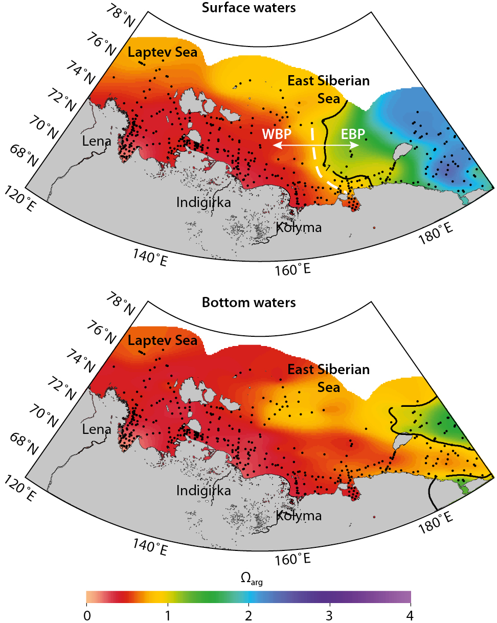Figure 2.3 Distribution of Ωarg over the East Siberian Arctic Shelf based on observations over the period 1999–2011 in surface waters and bottom waters. The white dashed curve shows the boundary between two biogeochemical provinces – the Western Biogeochemical Province and the Eastern Biogeochemical Province (modified from Semiletov et al., 2016).