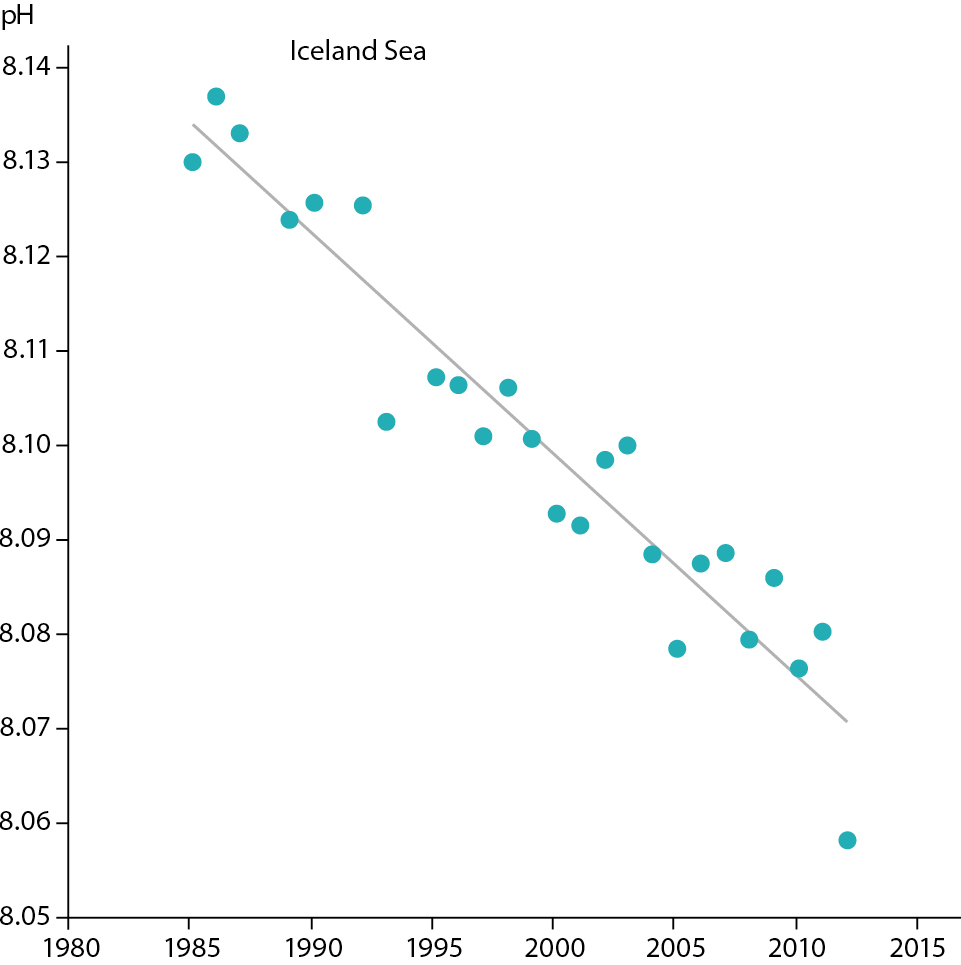 Figure 2.6 Iceland Sea surface water pHT (total pH) changes in winter (based on Olafsson et al., 2009).
