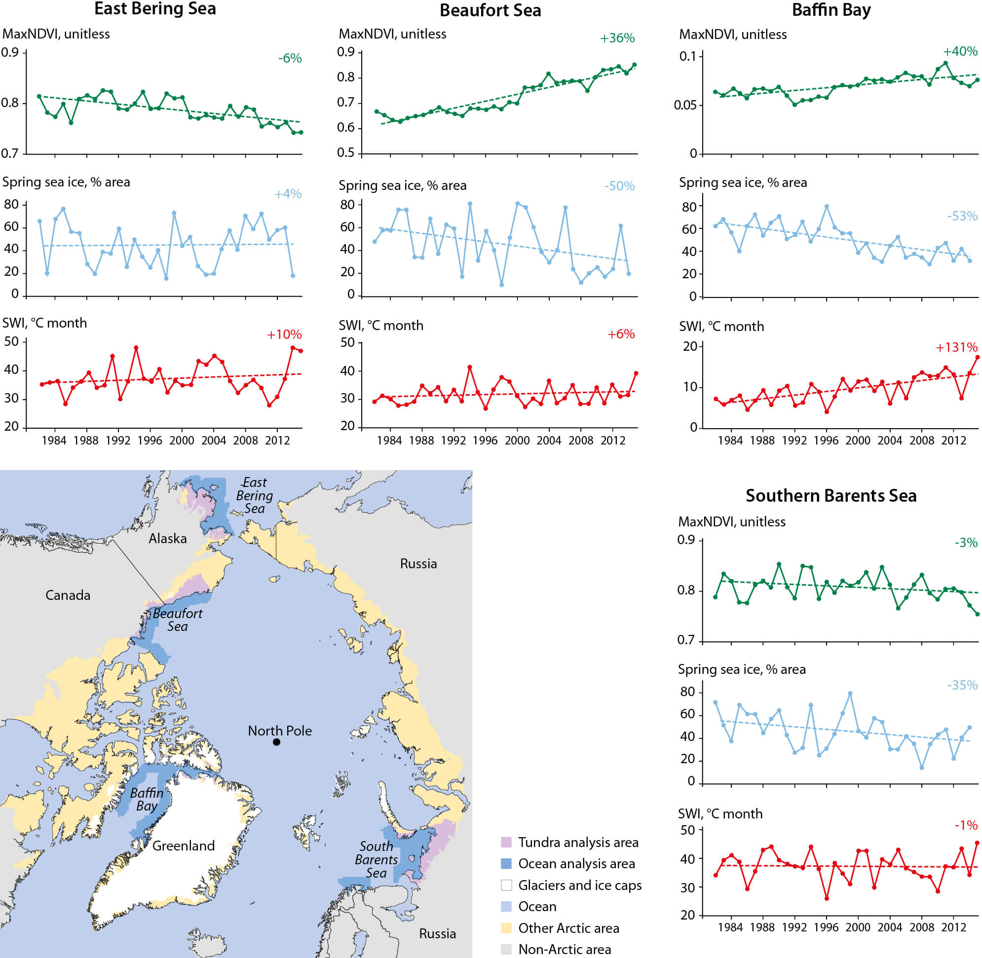 Figure 10.8 Trends in spring sea-ice extent within 100 km of the coast, Summer Warmth Index (SWI), and MaxNDVI for the period 1982–2015, for four areas exhibiting large and contrasting changes in sea-ice extent: East Bering Sea, Beaufort Sea, Baffin Bay and southern Barents Sea (Bhatt et al., 2010 updated to 2015). Sectoral divisions in the Arctic Ocean are according to the Russian Arctic Atlas (Treshnikov, 1985) and the adjacent land areas according the phytogeographic subdivisions (Yurtsev, 1994).