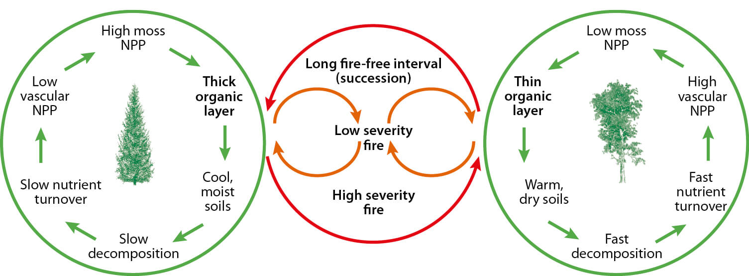 Figure 10.11 Soil organic layer dynamics across fire and successional cycles in taiga forest in interior Alaska. Adapted from Johnstone et al. (2010). NPP: net primary productivity.
