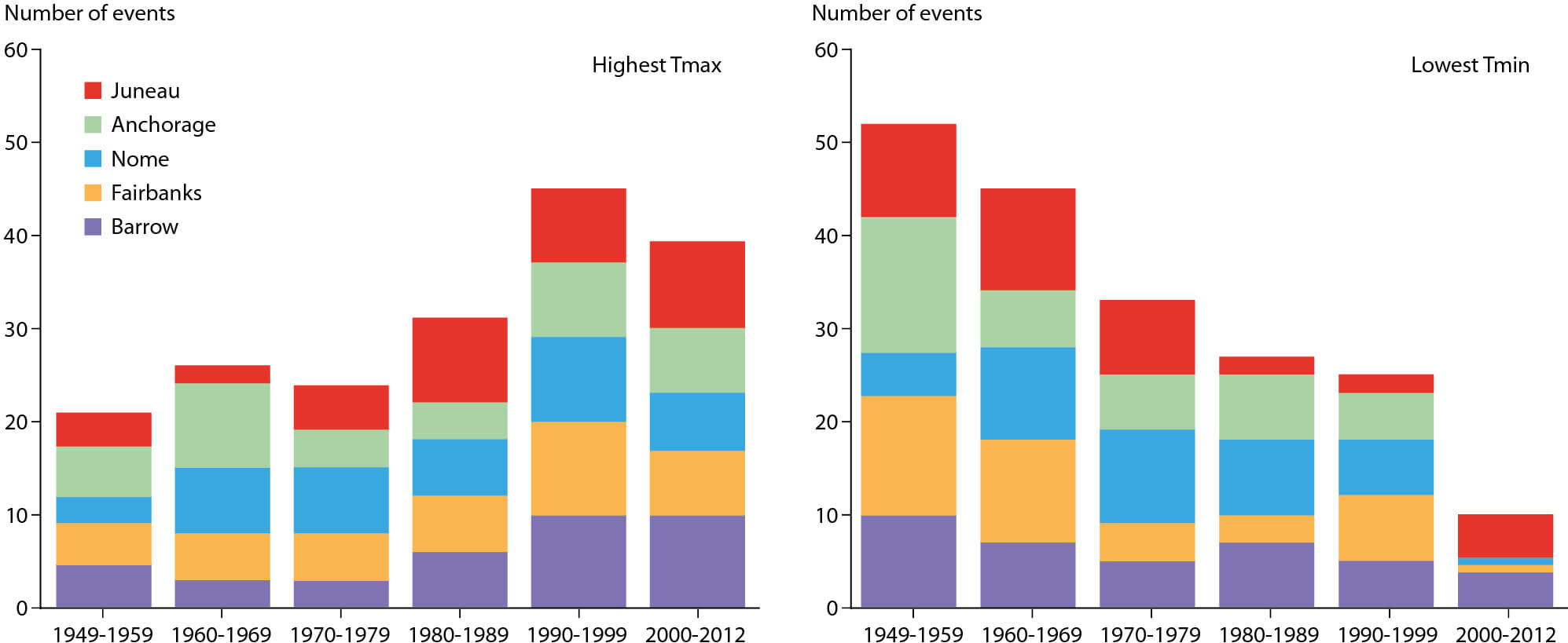 Figure 2.9 Decadal distributions of record-high daily maximum temperatures (left) and record-low daily minimum temperatures (right) for the period 1949–2012 at five first-order weather stations in Alaska. The bars for 2000–2012 have been adjusted to represent the number of events over 10 years (Bieniek and Walsh, 2017).