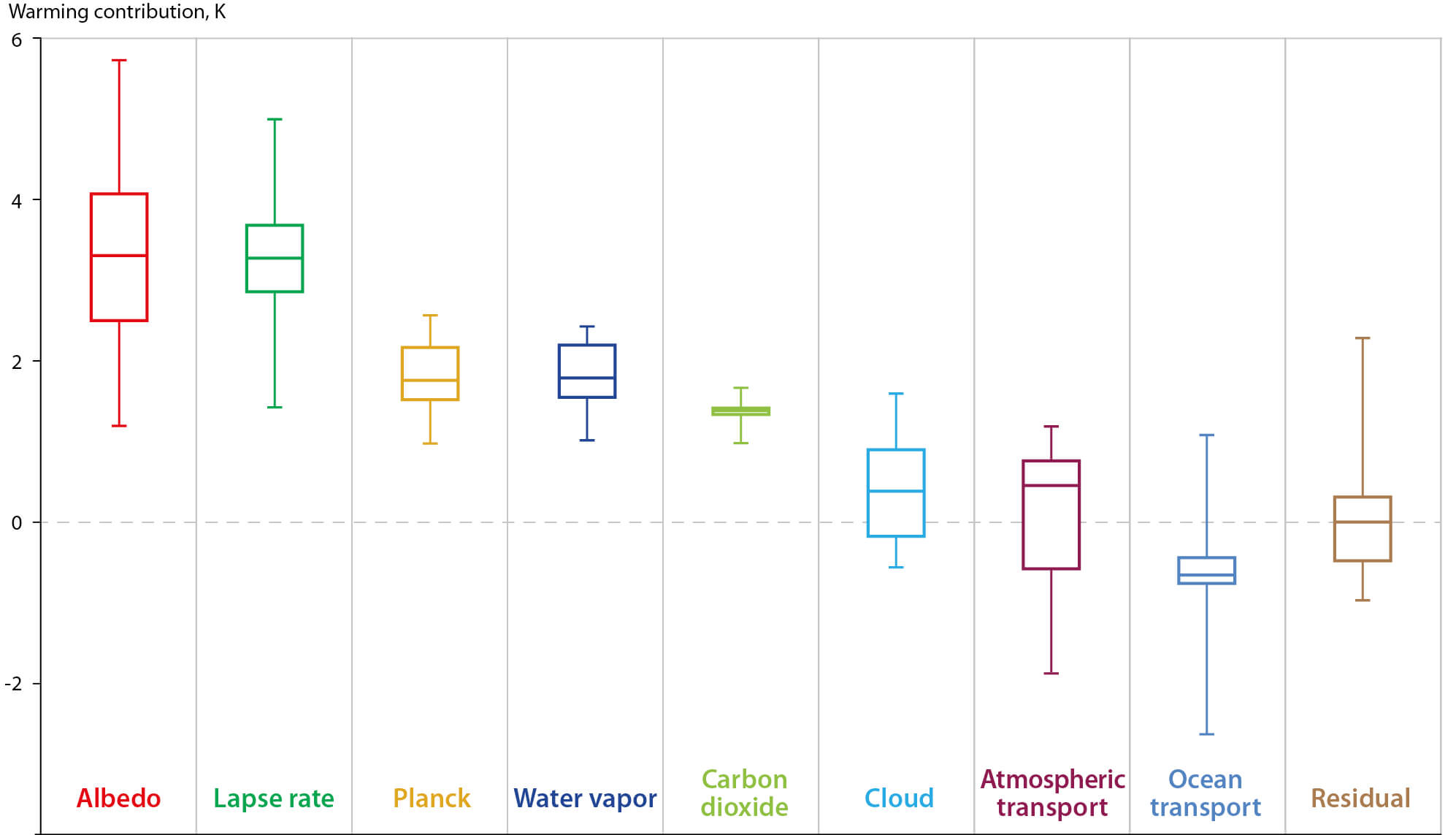 Figure 2.10 Contributions of various feedbacks to total Arctic warming in CMIP5 global climate models (Pithan and Mauritsen, 2014).