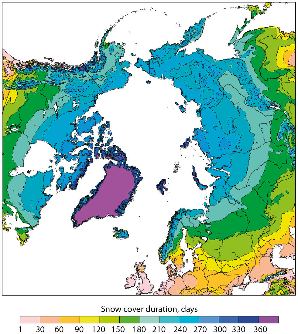 Figure 3.1 Mean annual snow cover duration over Arctic land areas from the NOAA IMS-24 daily snow cover analysis for the snow seasons 1998/99 to 2013/14.