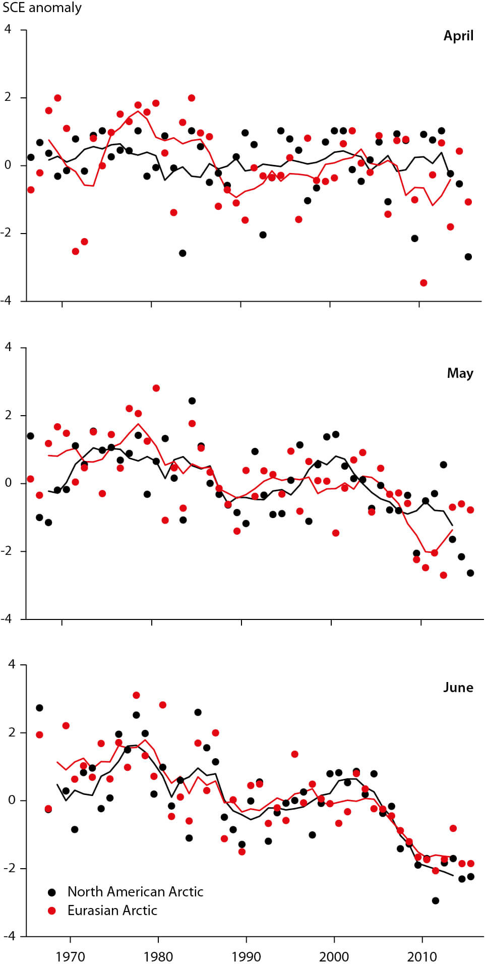 Figure 3.4 Monthly Arctic (land areas >60°N) snow cover extent (SCE) standardized (and thus unitless) anomaly time series for 1967–2016 (with respect to the 1981–2010 mean and standard deviation) from the NOAA CDR product (Estilow et al., 2015) for April, May and June. Solid lines depict 5-year running means.