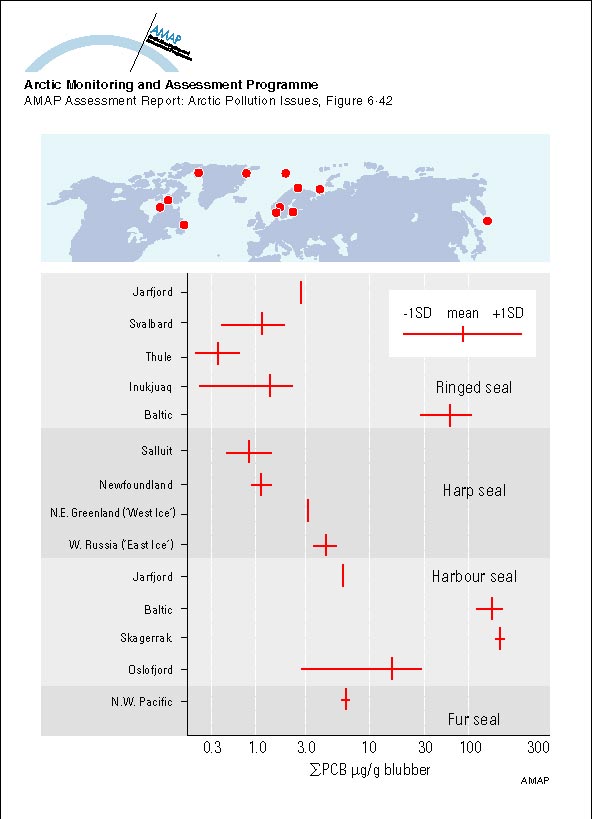 Comparison of sum-PCB concentrations in seal blubber from various Arctic regions with results from the same species in temperate waters Vertical bars represent means and the horizontal bars the standard deviation, where available