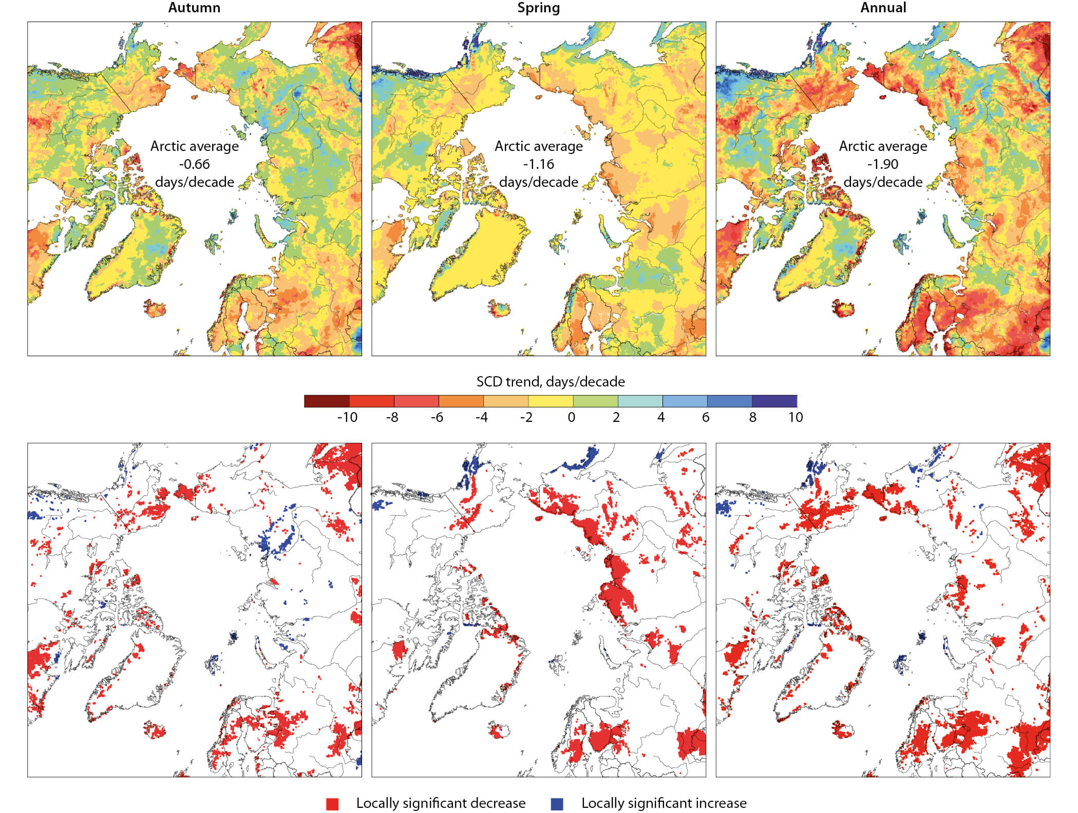 Figure 3.6 The upper panels show trends in snow-cover duration (SCD) in the snow-onset (autumn SCD, Aug–Jan) and melt periods (spring SCD, Feb–Jul) and annual SCD over snow seasons 1979/80 to 2009/10 from the Liston and Hiemstra (2011) snow cover reconstruction. Grid points with statistically significant (0.05 level) local trends for decreasing and increasing SCD are shown in the lower panels.