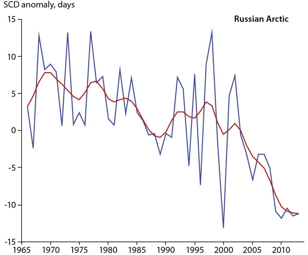 Figure 3.8 Regionally-averaged variability in annual snow-cover duration (SCD) anomalies (with respect to the 1981–2010 average) over the period 1966–2014 from daily snow depth observations at Russian stations located north of 60°N. Daily snow depths were interpolated to a 200-km grid and the grid values of SCD (days with snow depth >2 cm) used to compute the regional average. The red line is the result of applying a centered 9-term binomial filter. The trend over the period (-3.2 days per decade) is statistically significant at the 0.05 level.