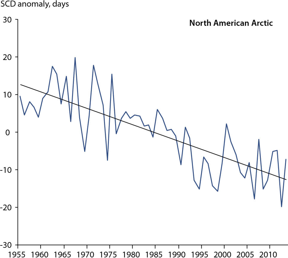 Figure 3.9 Regionally-averaged annual snow-cover duration (SCD) series over the North American Arctic north of 66°N (anomalies with respect to a 1971–2000 reference period) from 20 climate stations in the Global Historical Climate Network archive with ≥40 years of daily snow depth data in the 1950/51–2013/14 snow seasons. A 1971–2000 reference period was used to maximize the number of stations in the regional average. The trend over the period (-4.4 days per decade) is statistically significant at the 0.05 level.