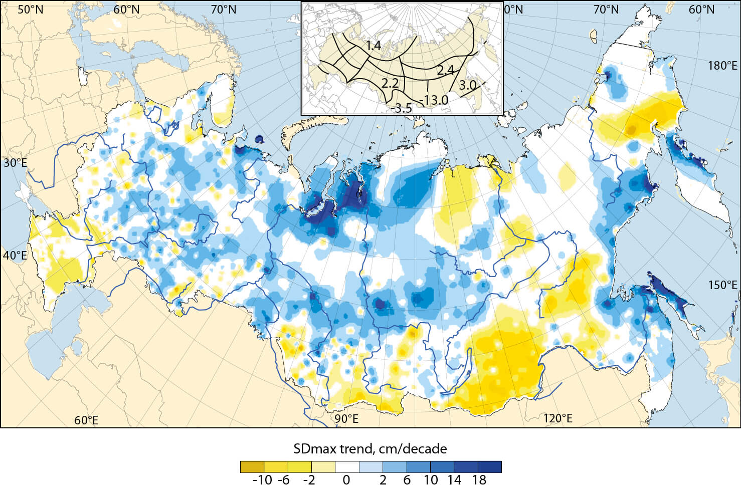 Figure 3.10 Linear trend estimates (1966–2014) in the time series of maximum winter snow depth (SDmax) at meteorological stations. The inset panel shows climate regions where the spatially-averaged trends (%/decade) were statistically significant at the 0.05 level.