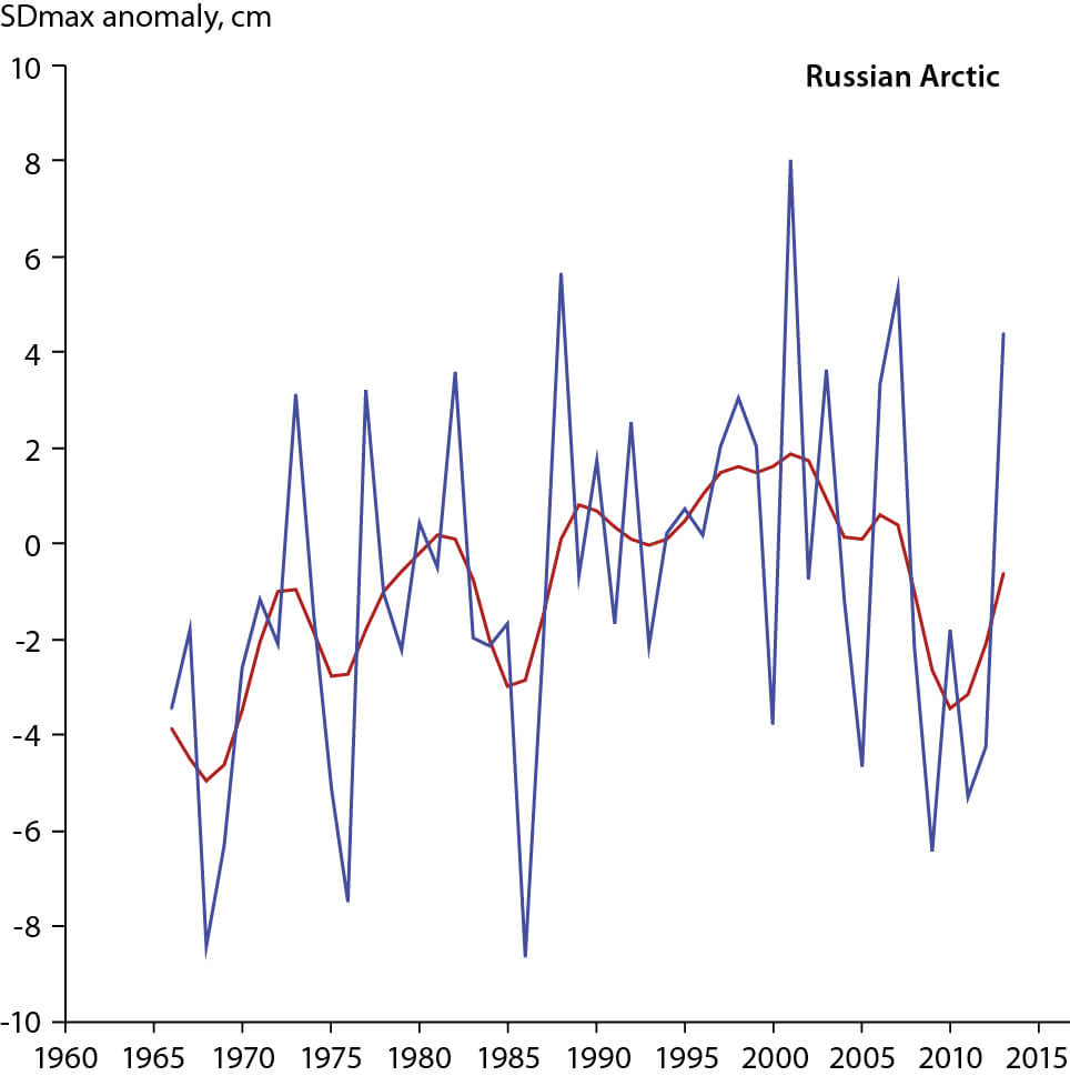 Figure 3.11 Historical variability in regionally-averaged annual maximum snow depth (SDmax) anomalies (with respect to the 1981–2010 average) for Russian stations in the Arctic following the regional averaging method described in Figure 3.8. The red line is the result of applying a centered 9-term binomial filter. The linear trend over the period is not statistically significant.