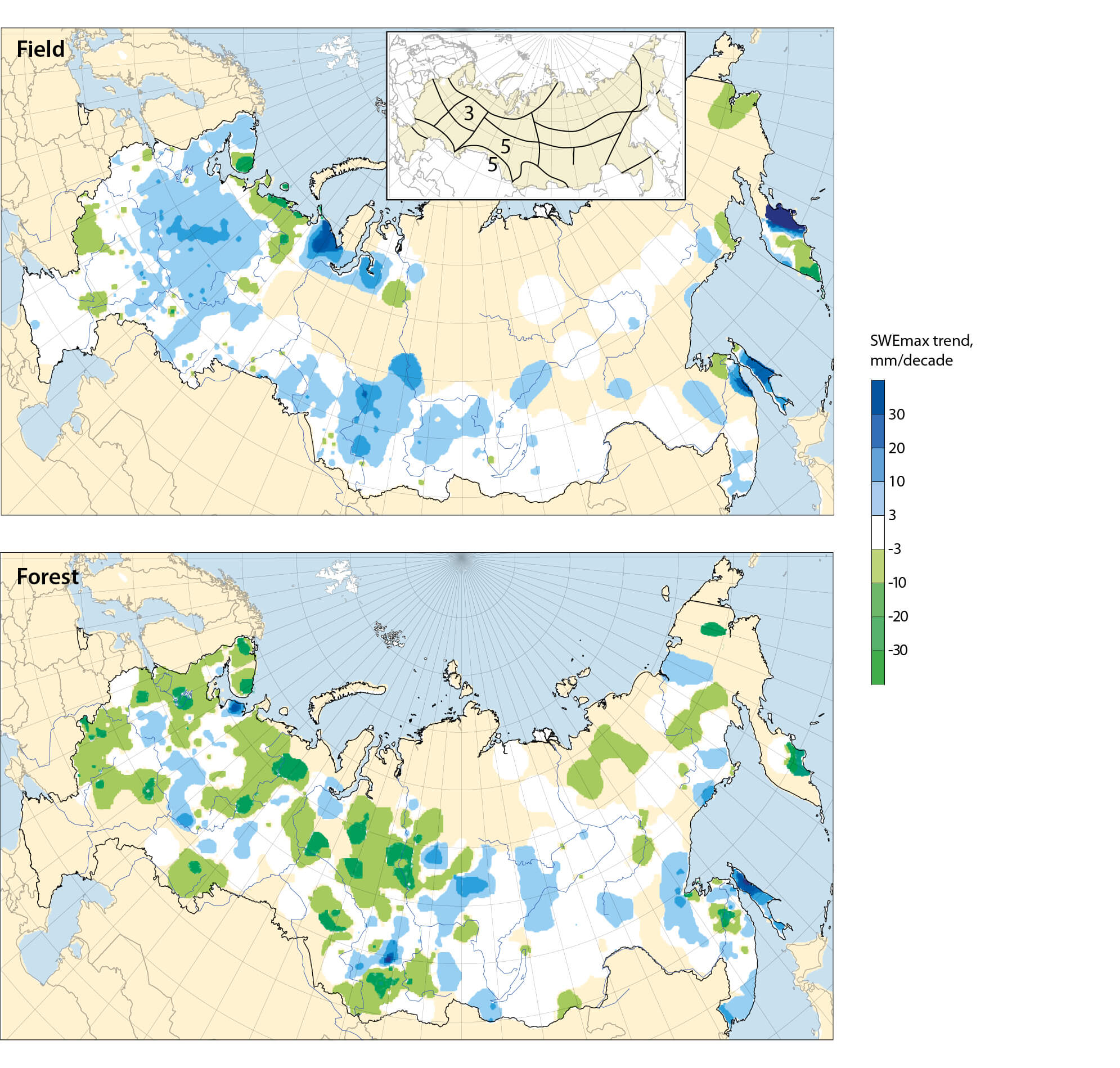 Figure 3.12 Linear trend estimates (1966–2014) in time series of annual maximum snow water equivalent (SWEmax) at meteorological stations in field and forest. The inset panel shows climate regions where the spatially-averaged trends (%/decade) were statistically significant at the 0.05 level. There were no climate regions with statistically significant trends for the forest SWE time series.