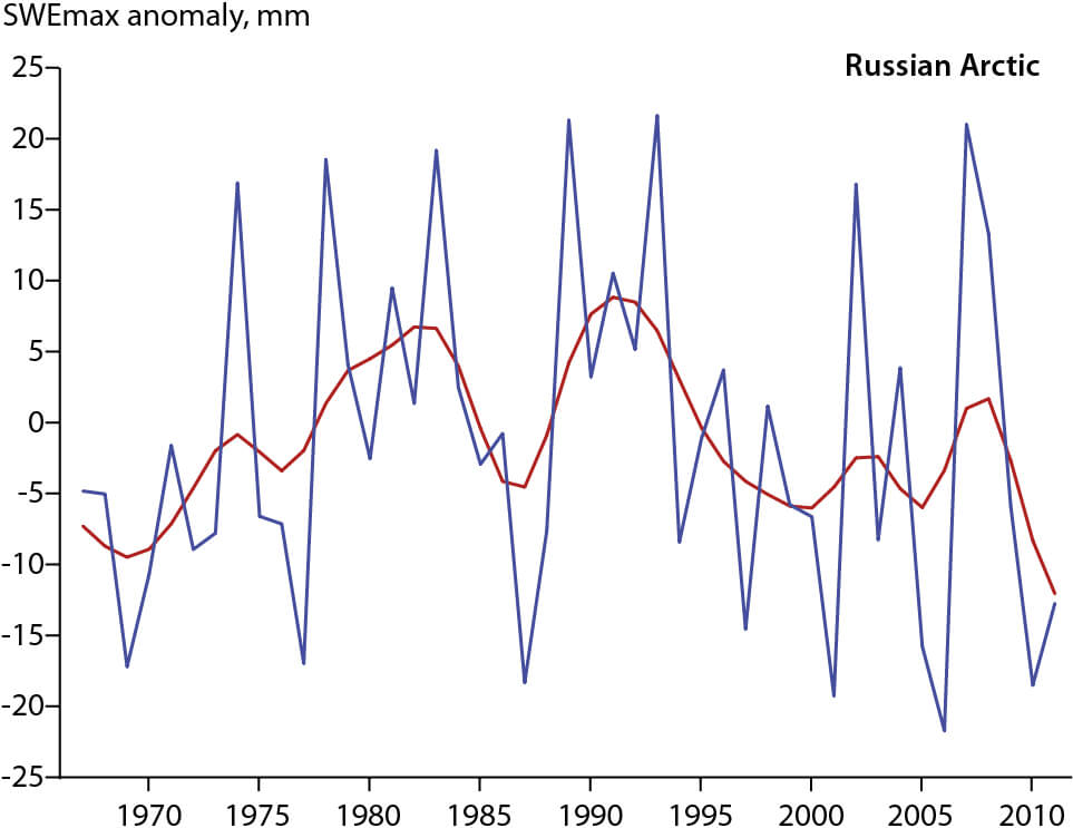 Figure 3.13 Historical variability in regionally-averaged annual maximum snow water equivalent anomalies (SWEmax) (Jan–May period; with respect to the 1981–2010 average) over all snow surveys in the Russian Arctic with at least 40 years of data in the period 1967–2011 following the regional averaging method described in Figure 3.8. The annual SWEmax series is significantly correlated (r=0.80) with the annual maximum snow depth series shown in Figure 3.11. The red line is the result of applying a centered 9-term binomial filter. There is no trend over the period of data shown.