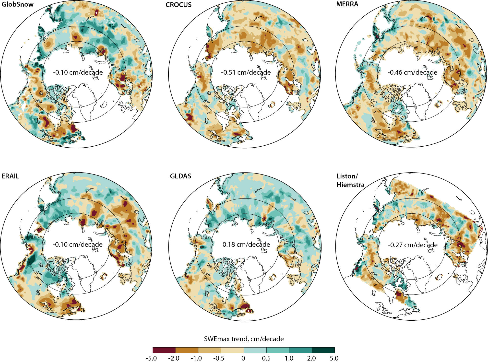 Figure 3.16 Estimated trend in Arctic annual SWEmax over the period 1981–2010 from six datasets (Greenland excluded). The trend in the land area averaged SWEmax series for 60–70°N is shown in each panel. The Liston and Hiemstra trend is computed for the period 1981–2009. Descriptions of the datasets used are provided by Mudryk et al. (2015).