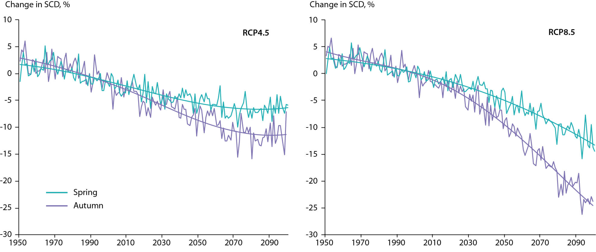 Figure 3.22 50th percentiles of projected relative change in regionally-averaged snow cover duration (SCD) over non-glacier land areas in the Baffin Bay-Davis Strait region in each half of the snow season under the RCP4.5 and RCP8.5 emission scenarios with respect to the period 1986–2005.