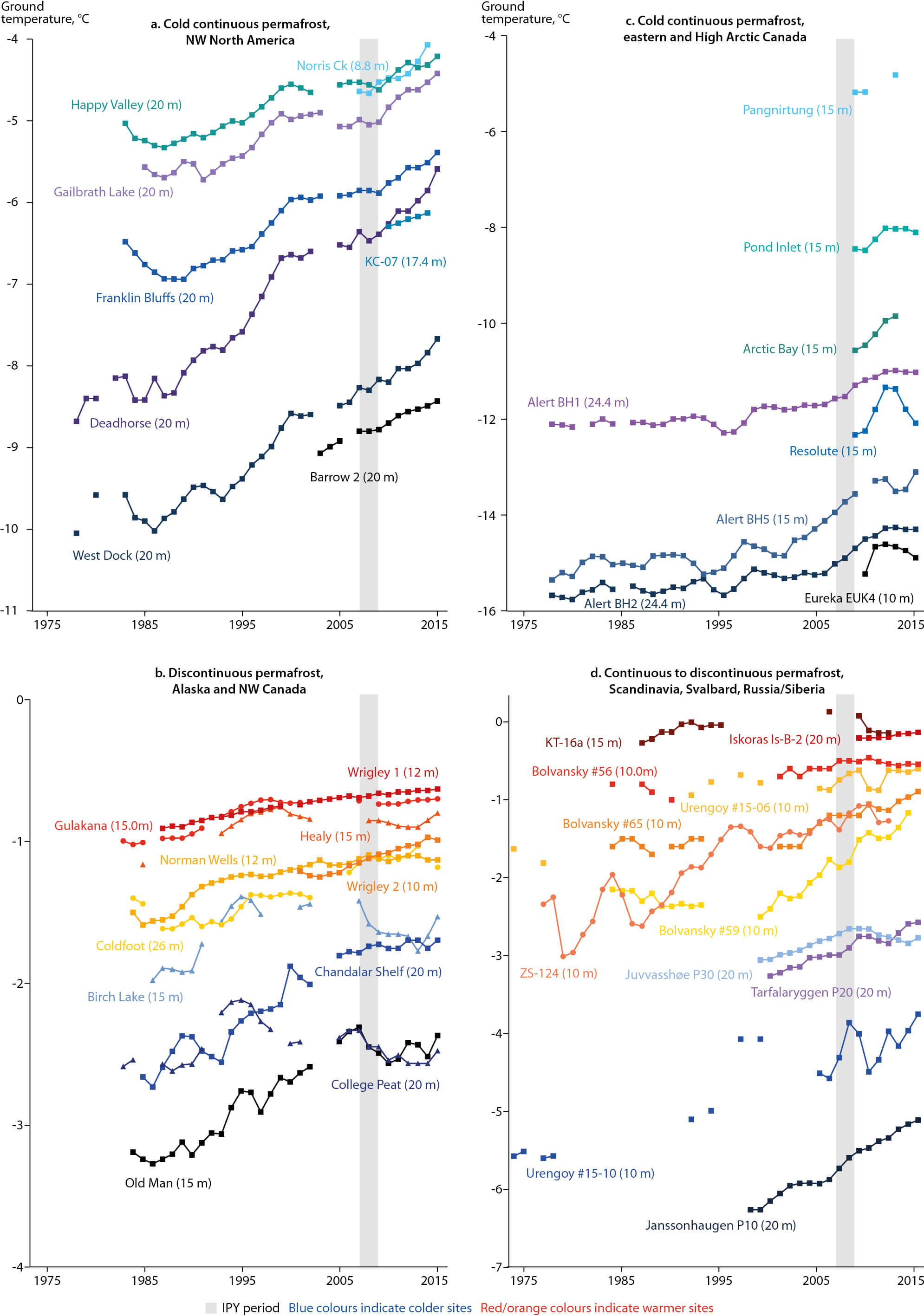 Figure 4.2 Time series of annual mean ground temperature at depths of 9 to 26 m below the surface at selected measurement sites (see Figure 4.1 for locations) that fall roughly into the AACA priority regions: (a) cold continuous permafrost of northwestern North America (Beaufort-Chukchi region); (b) discontinuous permafrost in Alaska and northwestern Canada; (c) cold continuous permafrost of eastern and High Arctic Canada (Baffin Davis Strait); and (d) continuous to discontinuous permafrost in Scandinavia, Svalbard, Russia/Siberia (Barents region). Temperatures are measured at or near the level of zero annual amplitude. Data series are updated from Christiansen et al. (2010), Romanovsky et al. (2014, 2015) and Ednie and Smith (2015).