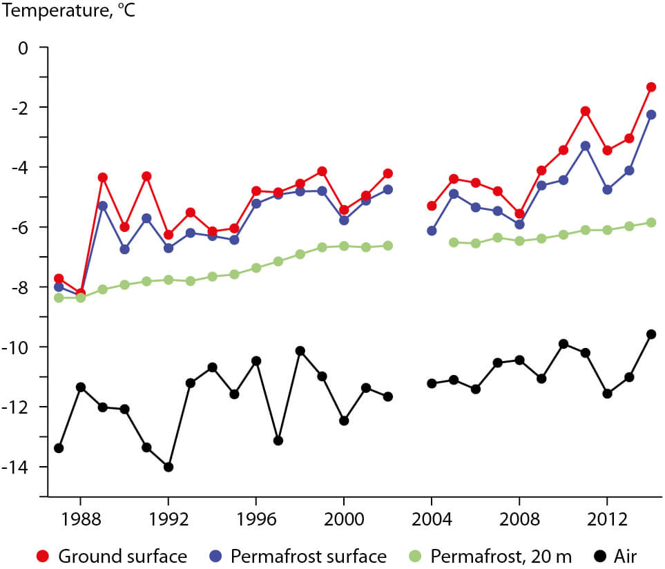Figure 4.4. Mean annual temperatures of air, ground surface, permafrost surface, and permafrost at 20 m depth recorded at the Deadhorse permafrost observatory in the period 1987–2014 on the North Slope of Alaska.