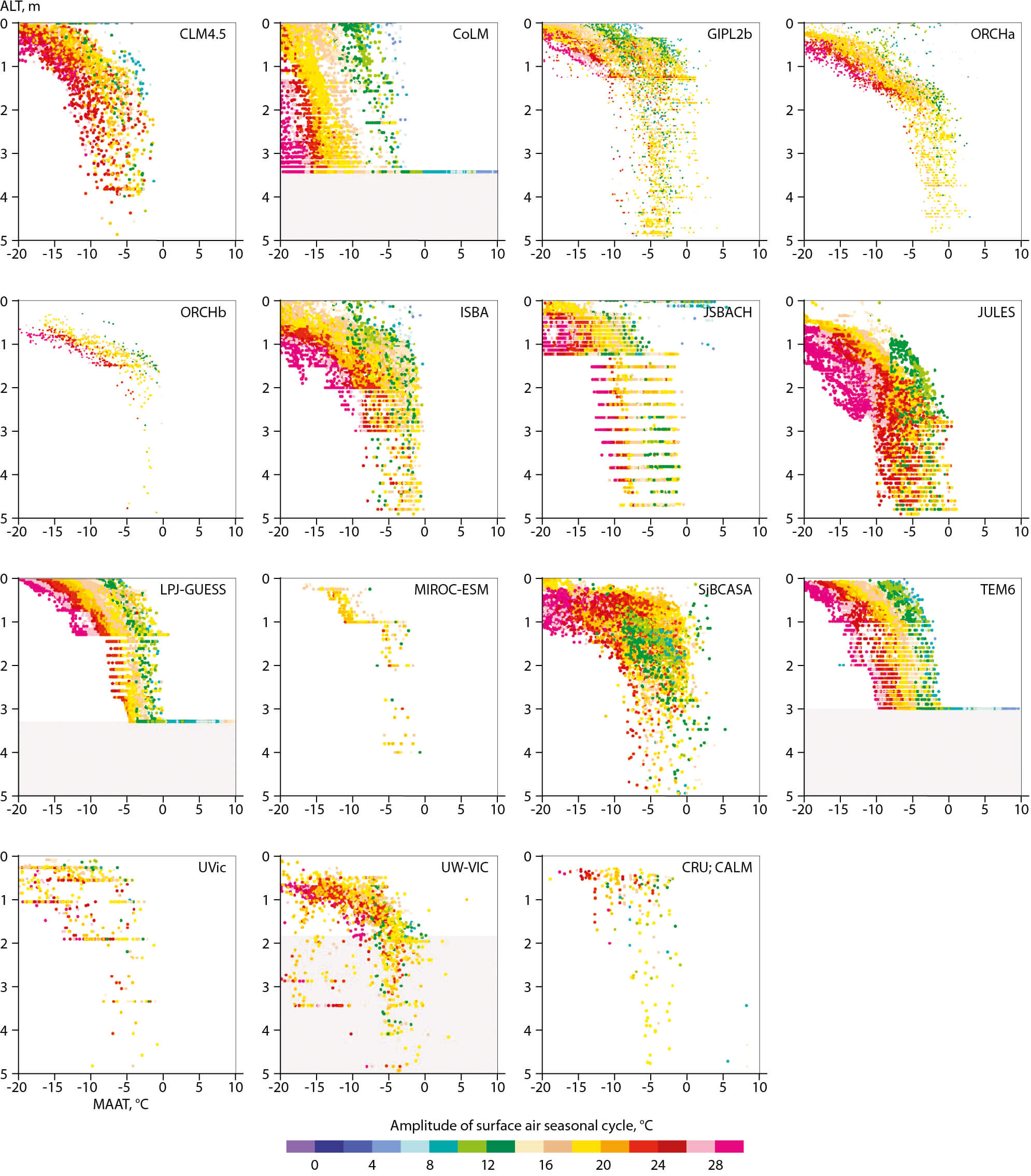 Figure 4.8 Model predictions of initial active-layer thickness (ALT) plotted as functions of mean annual air temperature (MAAT) and the amplitude of the seasonal cycle in surface air temperature, following Koven et al. (2013). Also shown are observations of ALT from the Circumpolar Active Layer Monitoring (CALM) project dataset. See Table 4.1 for model details (McGuire et al., 2016).