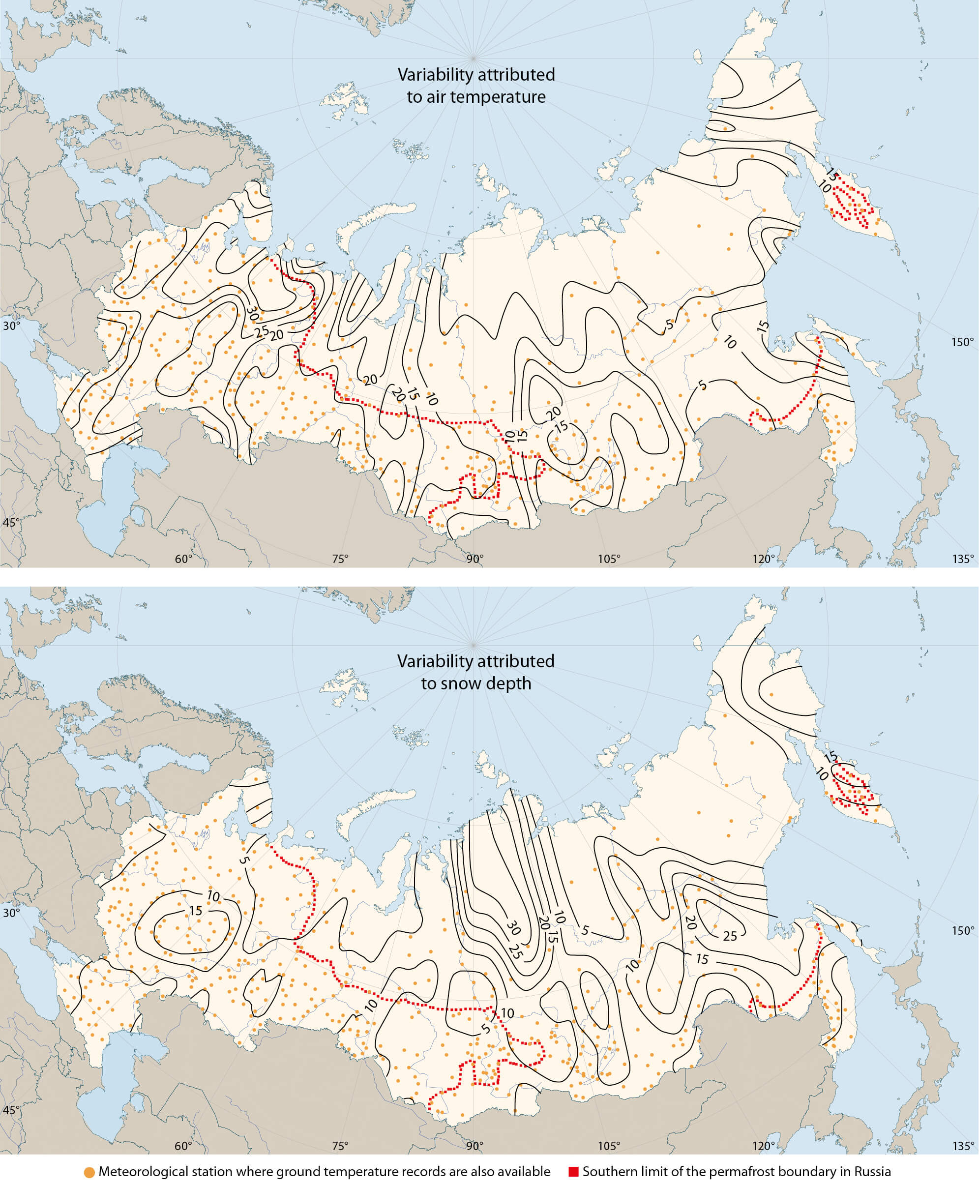 Figure 4.14 Percentage of total ground temperature variability attributed to air temperature (upper) and snow depth (lower) (Anisimov and Sherstukov, 2016).