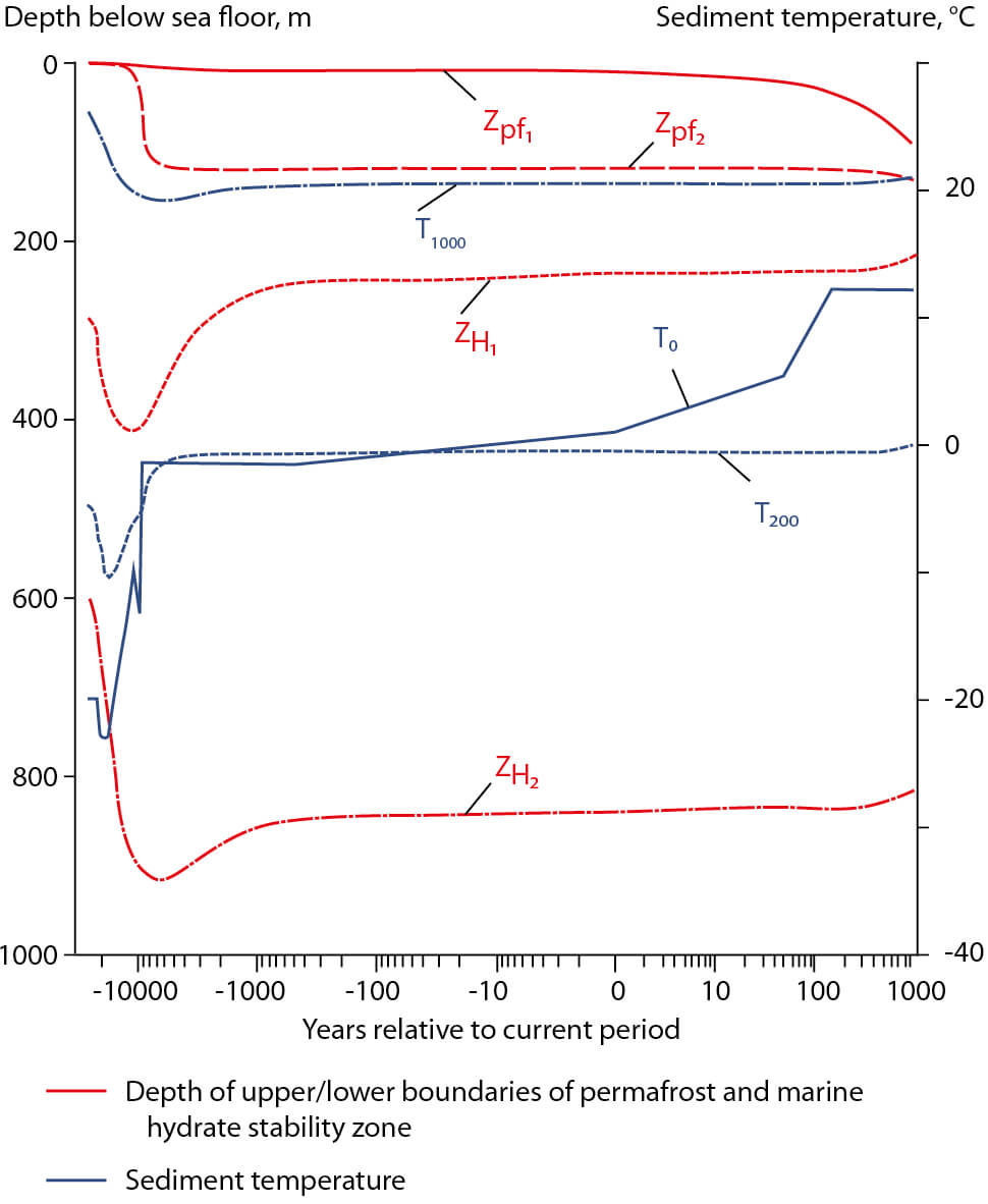 Figure 4.17 Modeled permafrost dynamics over geological time scales (Anisimov et al., 2012a). Blue curves show modeled changes in sediment temperature (vertical axis on right) over time at near-bottom level (T0), 200 and 1000 m below the sea floor (T200 and T1000, respectively). Red curves show depth (vertical axis on left) to upper (Zpf1) and lower (Zpf2) permafrost boundaries, and the upper (ZH1) and lower (ZH2) boundaries of the methane hydrate stability zone. Time (years) is shown on the horizontal axis in a logarithmic scale with respect to the current period (0).