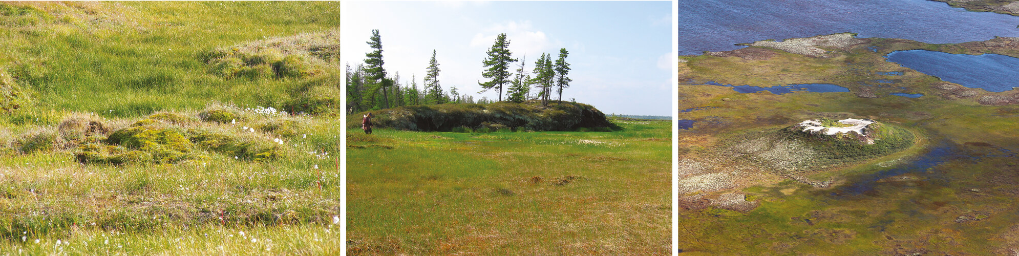 Figure 4.22 Modern frost-heave mounds in central Yamal, Russia (a) (photo M.O. Leibman), old degrading frost heave mound on the Tazovsky Peninsula, Russia (b) (photo O.E. Ponomareva), and a collapsed pingo on the Tazovsky Peninsula, Russia (c) (photo A.I. Kizyakov).