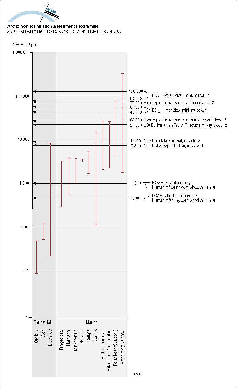 Sum-PCB (ng/g lw) in Arctic mammals compared to thresholds for mammalian effects (1 Leonards et al 1995, 2 Tryphonas 1994, 3 Kihlström et al 1992, 4 Olsson et al 1996a, 5 Boon et al 1987, 6 Ahlborg et al 1992, 7 Helle et al 1976b)