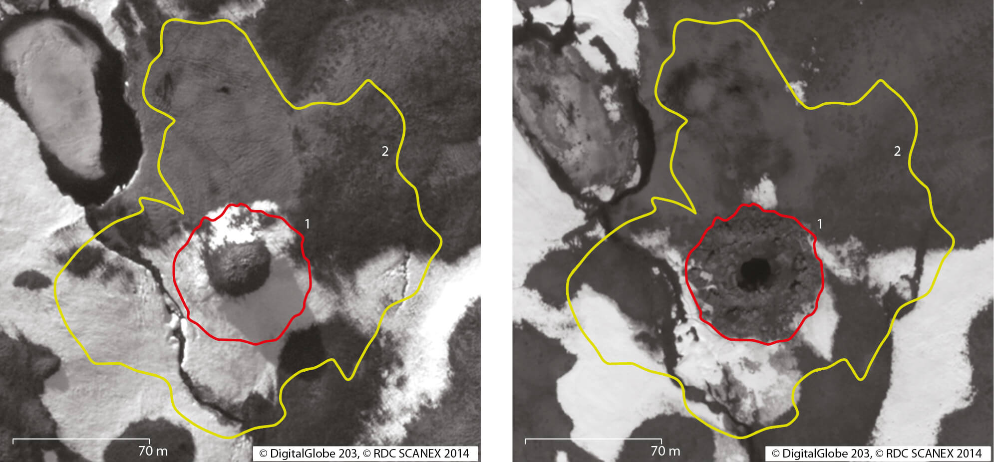 Figure 4.23 High-resolution black and white Digital Globe™ satellite imagery (WorldView-1) showing the presence of an 8-m high pingo-like mound on 9 June 2013 (left) and the same location on 15 June 2014 revealing the recently discovered Siberian crater (right). The height of the mound prior to crater formation was estimated using shadow length and sun angle at the time the image was acquired. The red line shows the outline of the surrounding ‘parapet’. The yellow line delimits the area where the chunks of soil ejected from the crater were found (Kizyakov et al., 2015).