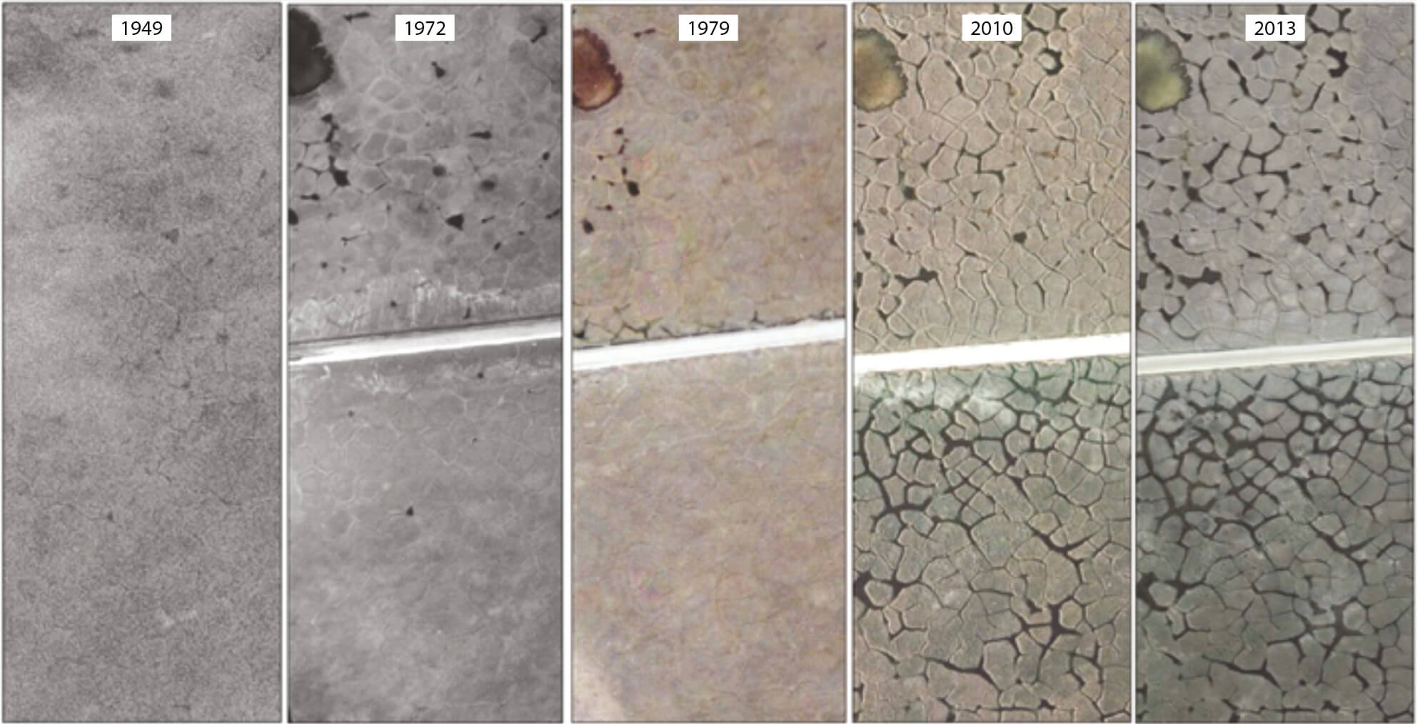 Figure 4.25 Progression of thermokarst from 1949 to 2013 along a section of the Prudhoe Bay Spine Road. The Spine Road was constructed in 1969 so it does not appear on the 1949 image. Thin cloud cover obscures the small lake in the upper left corner of the photo, but most of the thermokarst pits that were present in 1972 are also visible on the 1949 image. In 1972, gravel from road construction occurs on both sides of the road. In 1979, some roadside thermokarst is visible near the road on the north side (above the road in the photo). By 2010, extensive thermokarst is present on both sides of the road, but is most developed south of the road due to periodic flooding from a nearby lake. By 2013, most thermokarst on the south side of the road was connected to Lake Colleen by continuous channels of water in the polygon troughs (Walker et al., 2014).