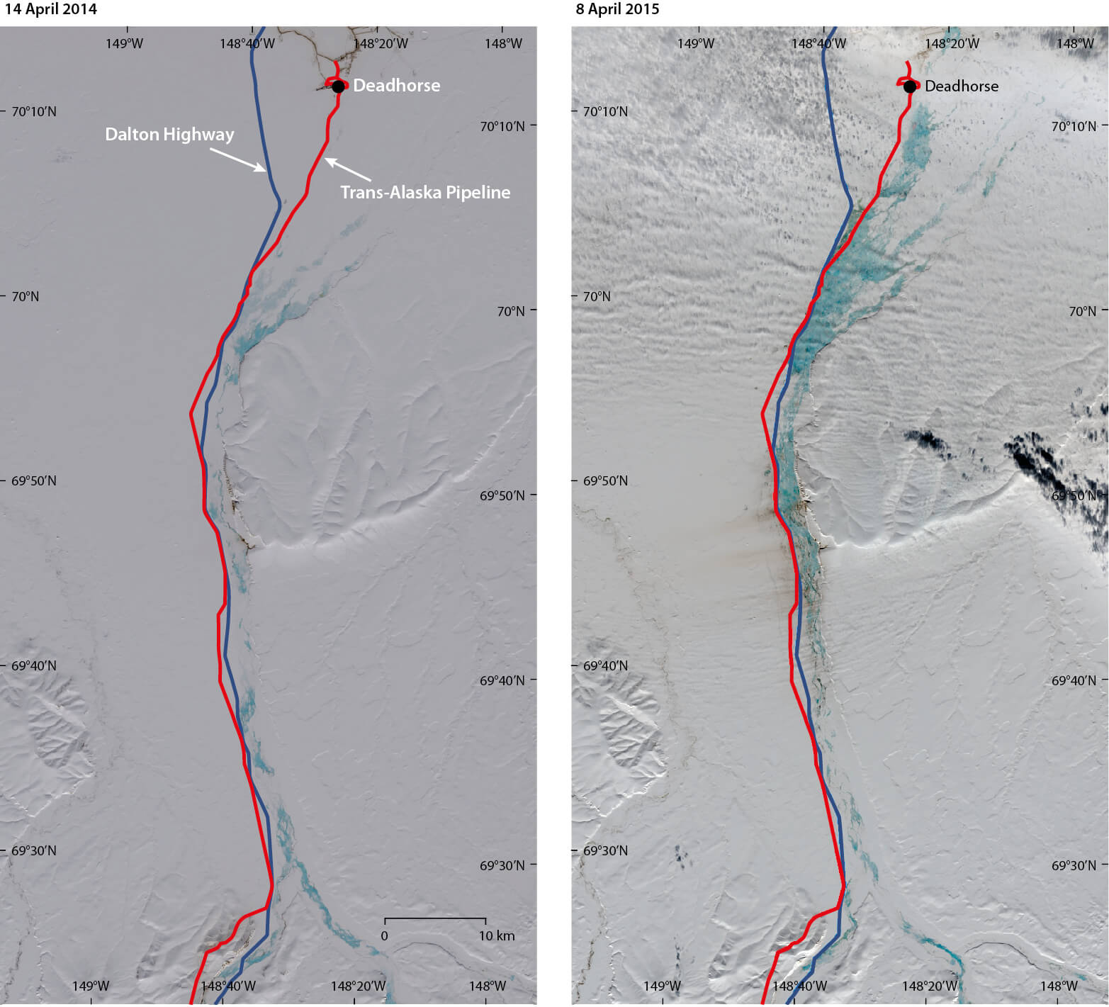 Figure 4.27 Comparison of overflow waters along the coastal plain portion of the Sagavanirktok River in April of a ‘normal’ year (2014) and during the flood year of 2015. Note the large amount of overflow in the vicinity of Franklin Bluffs in 2015, and in the Sagavanirktok River delta south of Deadhorse adjacent to the Dalton Highway. Images in both years are from Landsat-8. Maps by Lisa Wirth, Geographic Information Network of Alaska, UAF.