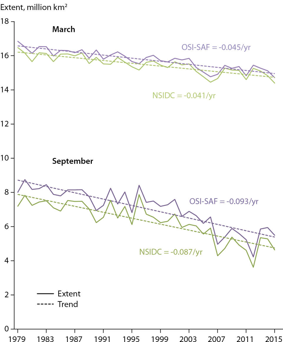 Figure 5.1 March and September Arctic sea-ice extent from the National Snow and Ice Data Center (NSIDC) and the Ocean and Sea Ice Satellite Application Facility (OSI-SAF) and linear trend lines (data source: NSIDC Sea Ice Index and OSI-SAF).
