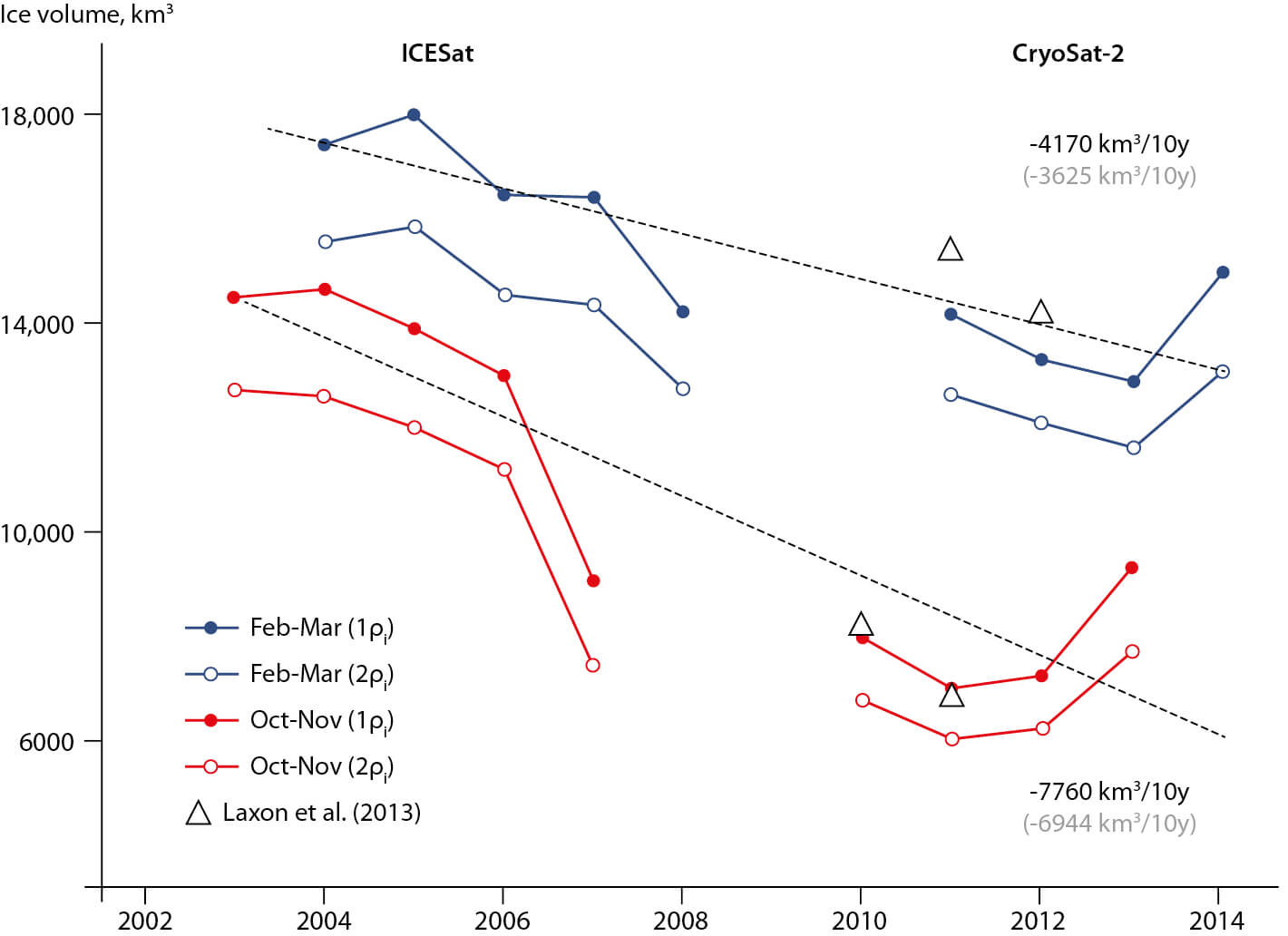 Figure 5.4 ICESat and CryoSat-2 sea-ice volume for late winter (Feb/Mar) and early autumn (Oct/Nov) for two different density values (ρi) (Kwok and Cunningham, 2015).